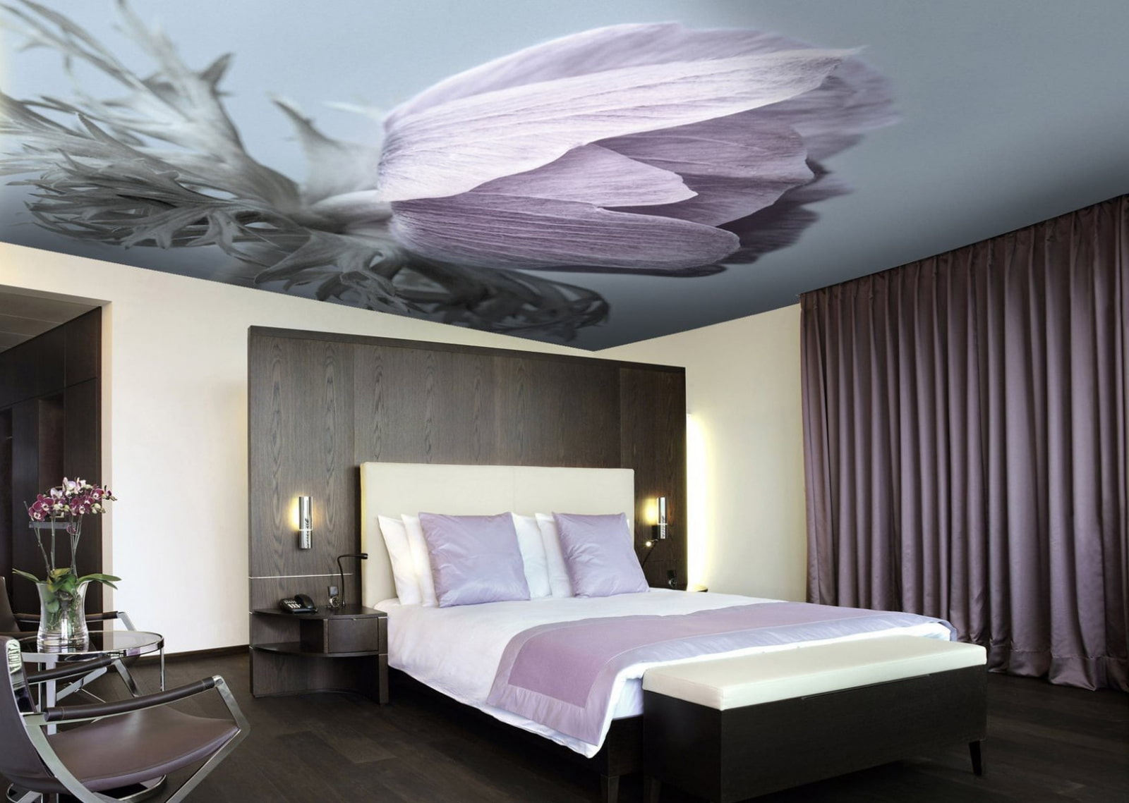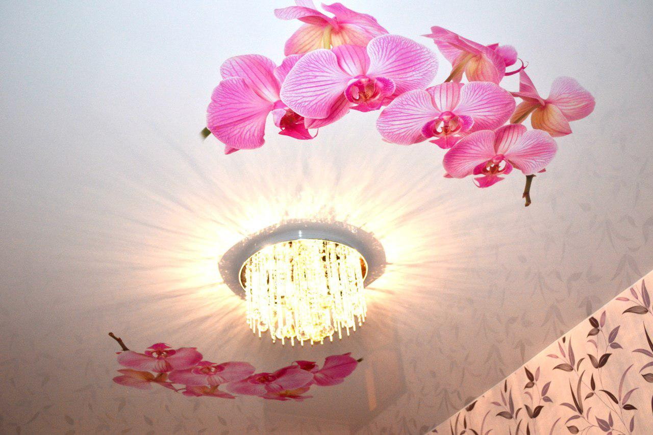 Graceful, exotic orchids in combination with a light stretch ceiling will look very harmonious, gentle and charming.