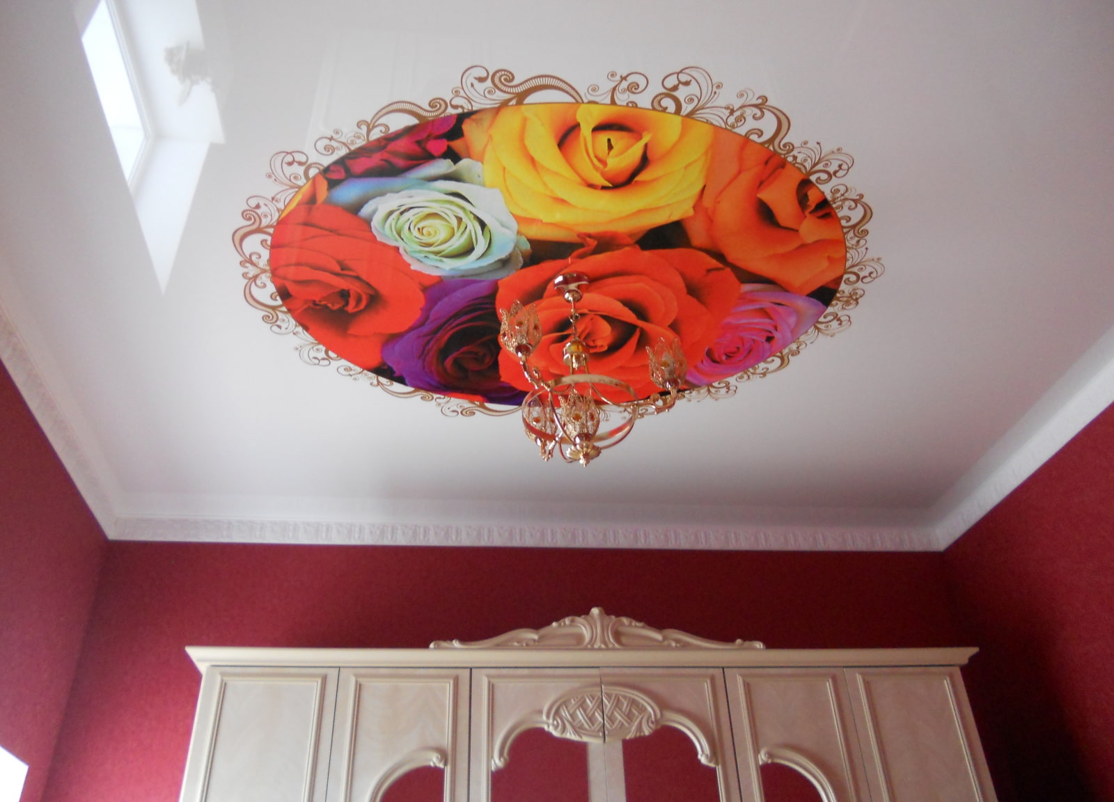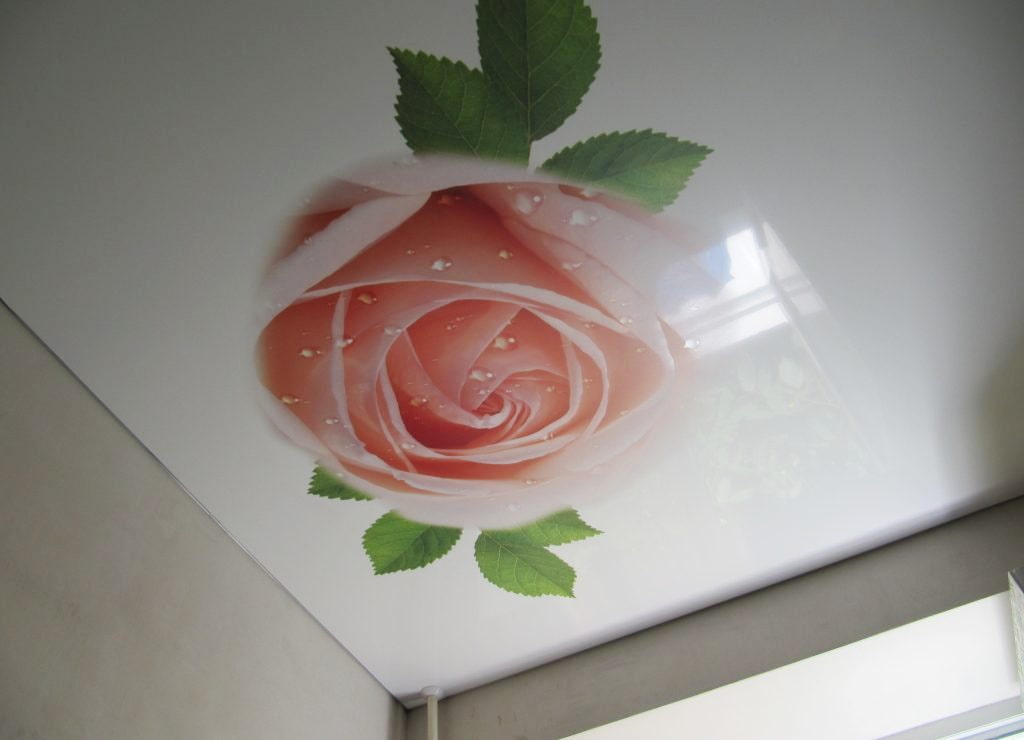In the photo there is a stretch ceiling decorated with a photo print in the form of rose flowers.