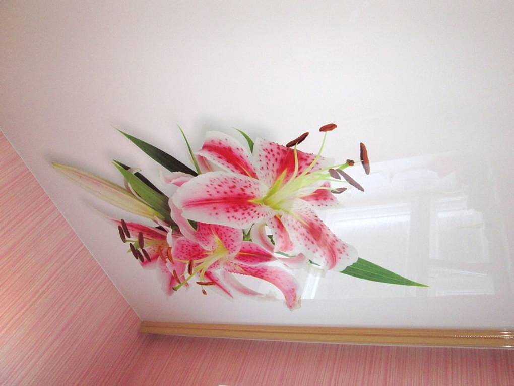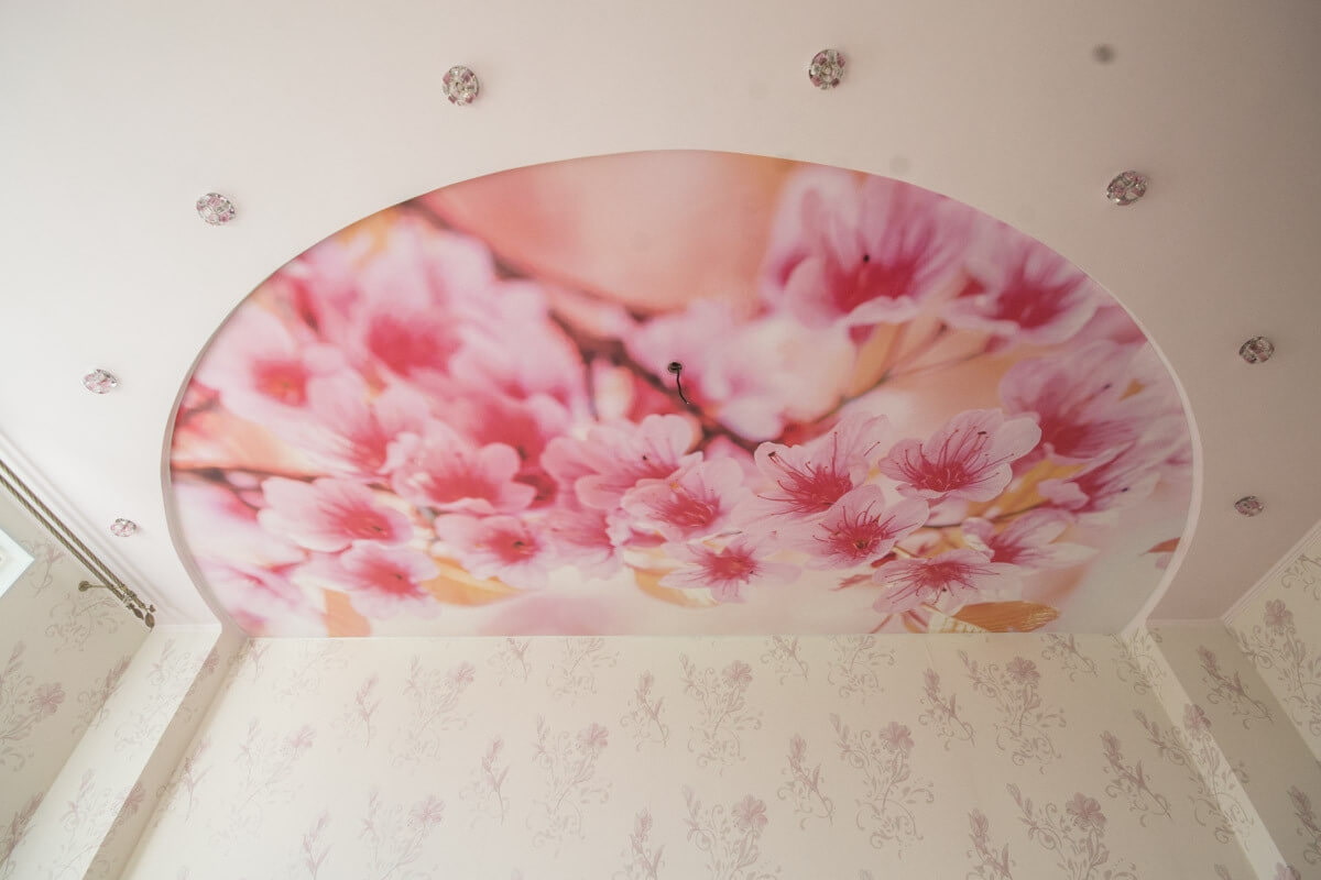 In the photo there is a stretch ceiling with a floral photo print located over the entire surface.