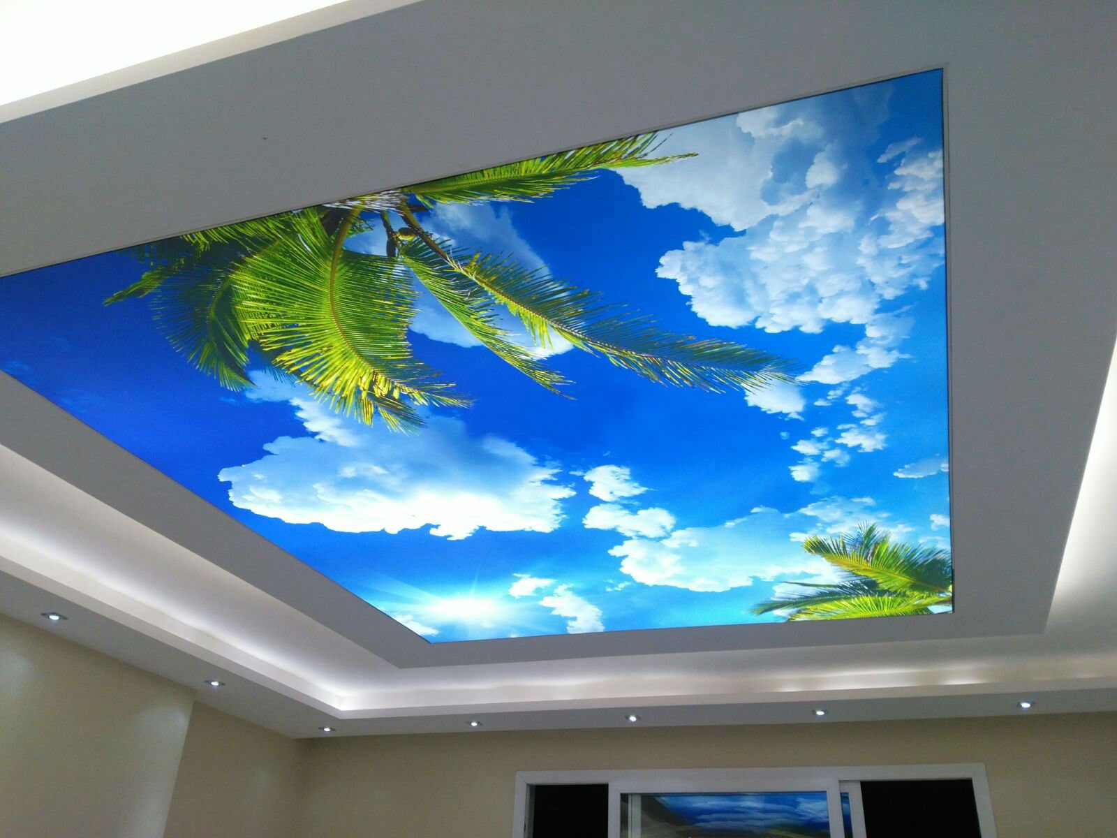 In the photo there is a stretch ceiling with a photo print of a blue sky with palm trees.