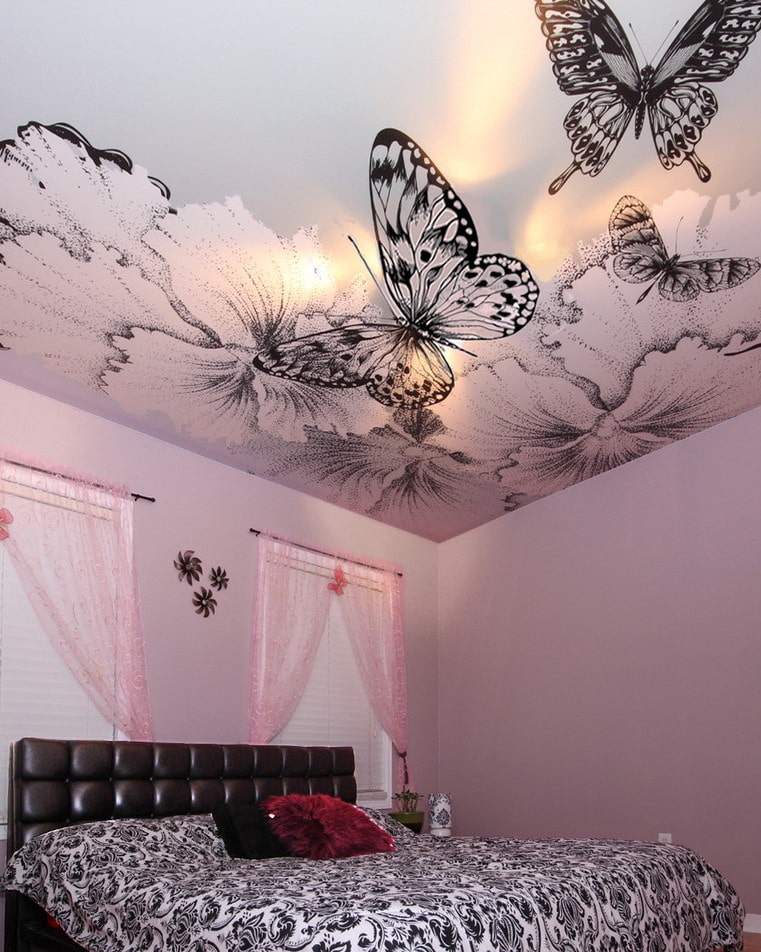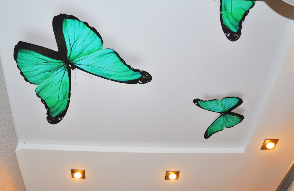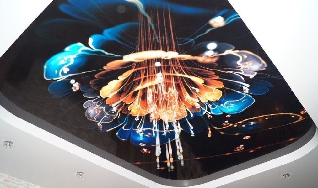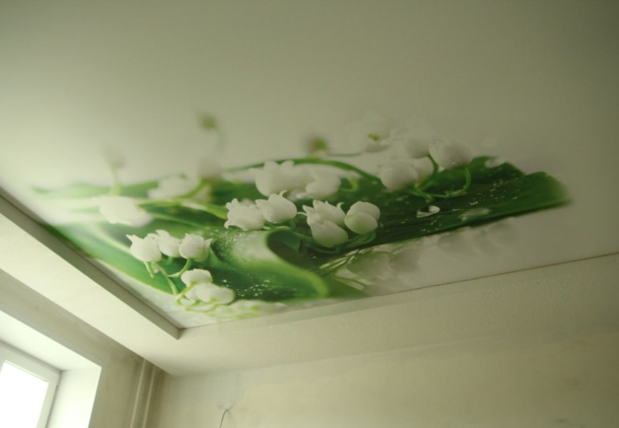 In the photo there is a white stretch ceiling with patterned photo printing.