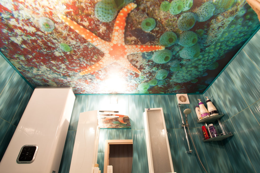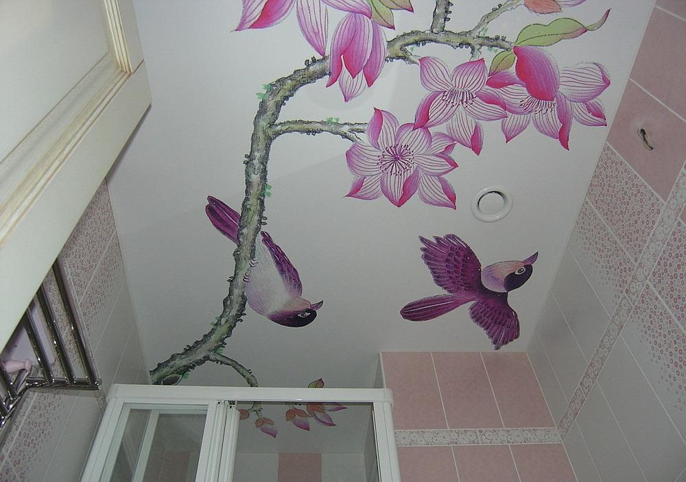 An art ceiling with a specific plot, well-chosen for the overall design of the room, will give the bathroom a unique style and the necessary mood.