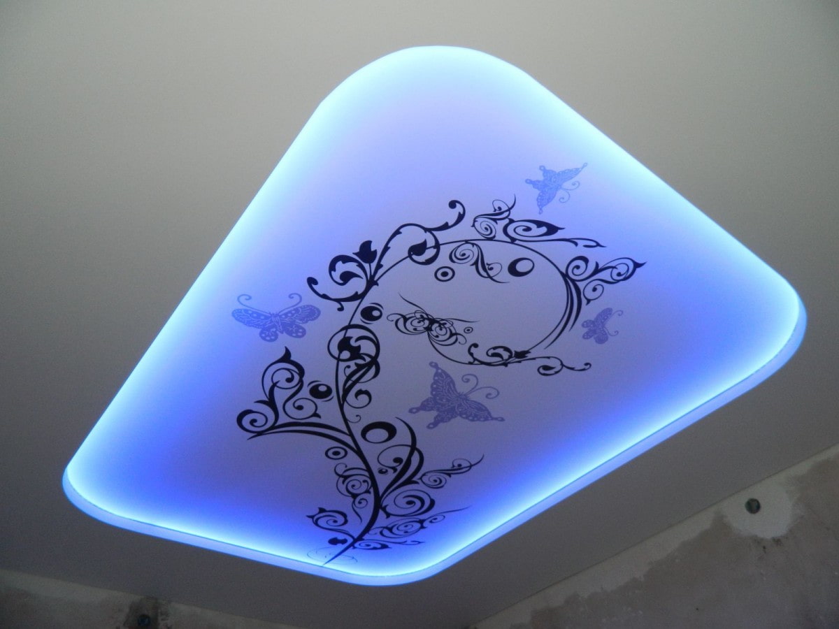 In the photo there is a white stretch ceiling with photo printing, decorated with backlighting.