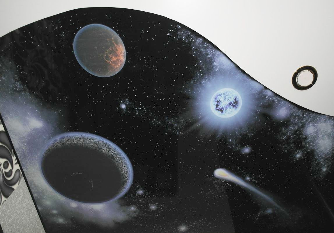 In the photo there is a black stretch fabric with a photo printing of space.