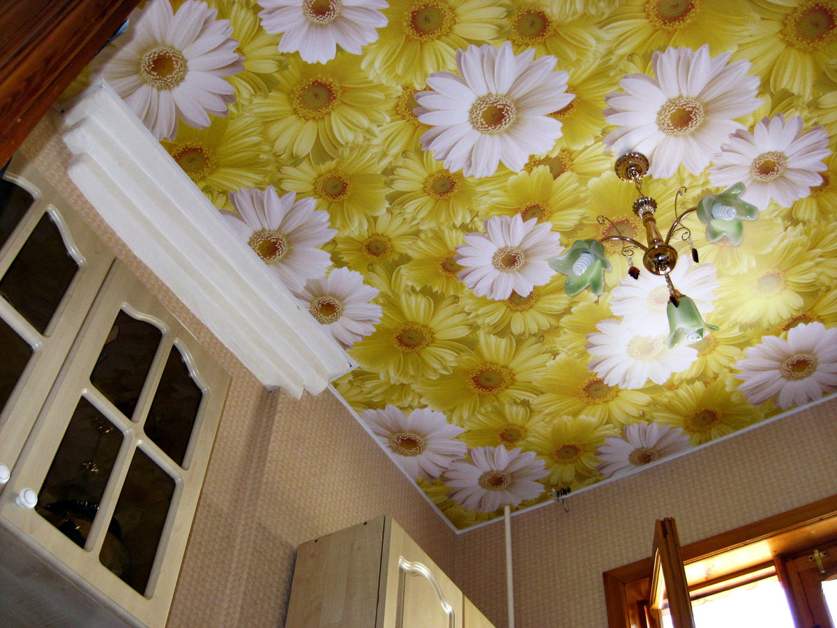 In the photo there is a white stretch ceiling with a picture of daisies.