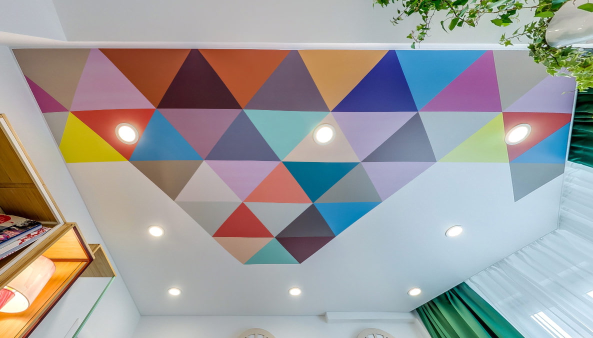 Creates visual volume, brings a sense of freshness and cleanliness to the interior. Drawings on the white ceiling look much brighter and more colorful.