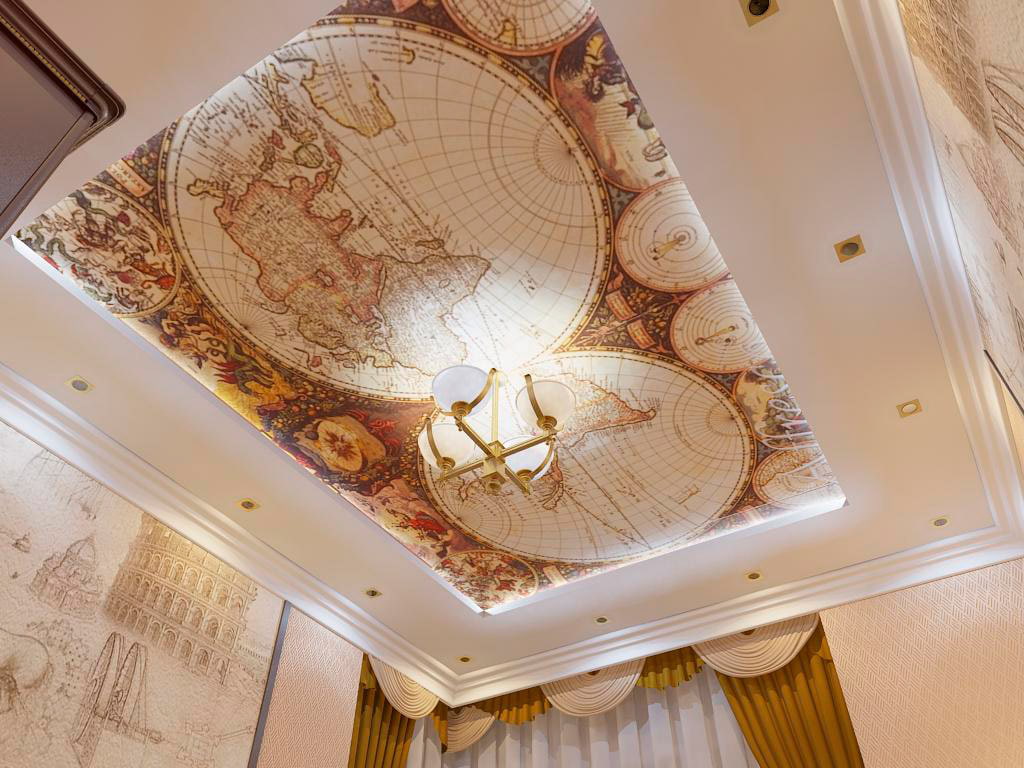 In the photo there is a matte stretch ceiling with the image of the world map.