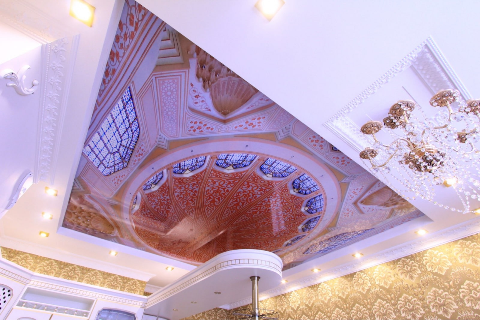 Stretch ceilings with photo printing in the form of golden frescoes or with an antique effect will add a palace look to the room and a feeling of lightness and transparency.