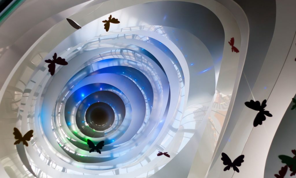 Circles, squares, rhombuses, triangles or other geometric shapes form a complex and even slightly cosmic interior.