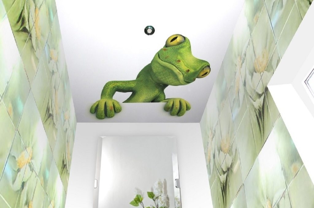 In the photo there is a stretch ceiling structure, decorated with a photo print with a picture of a lizard.
