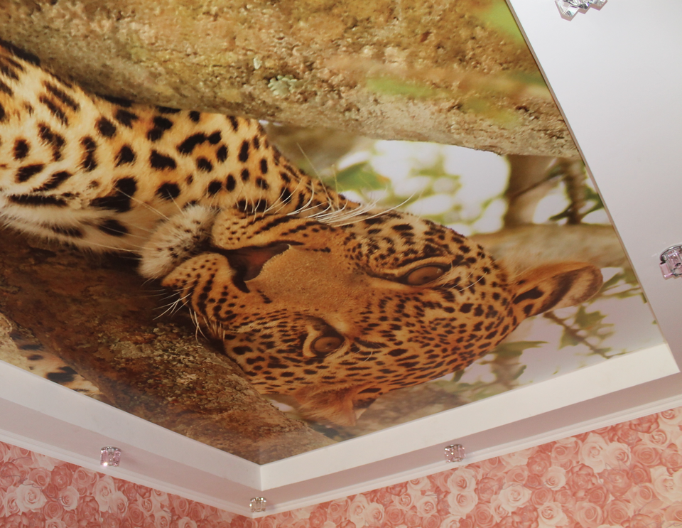 In the photo there is a stretch ceiling structure with a photo print in the shape of a leopard.