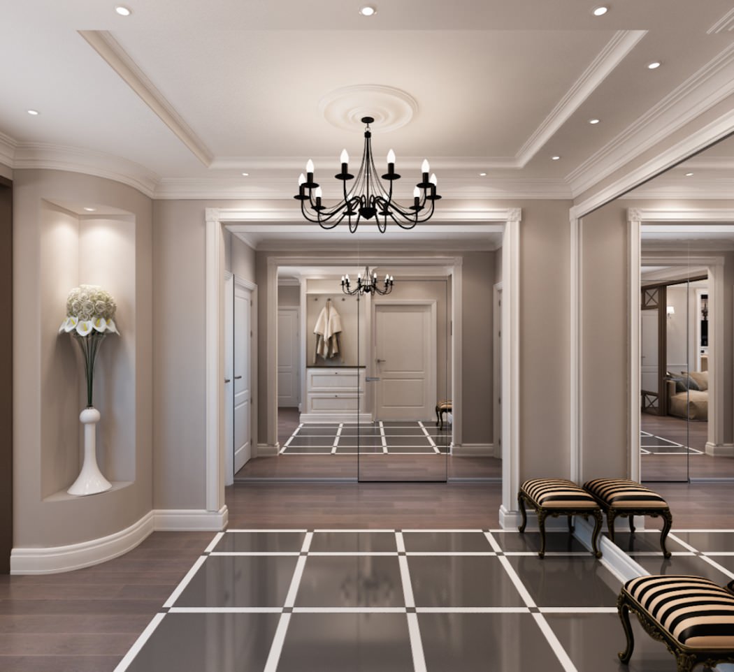 Lighting plays a very important role in neoclassical interiors, which should have a soft and diffused glow. Matte backlighting will optimally emphasize the exquisite design and visually combine all its details into a single composition.