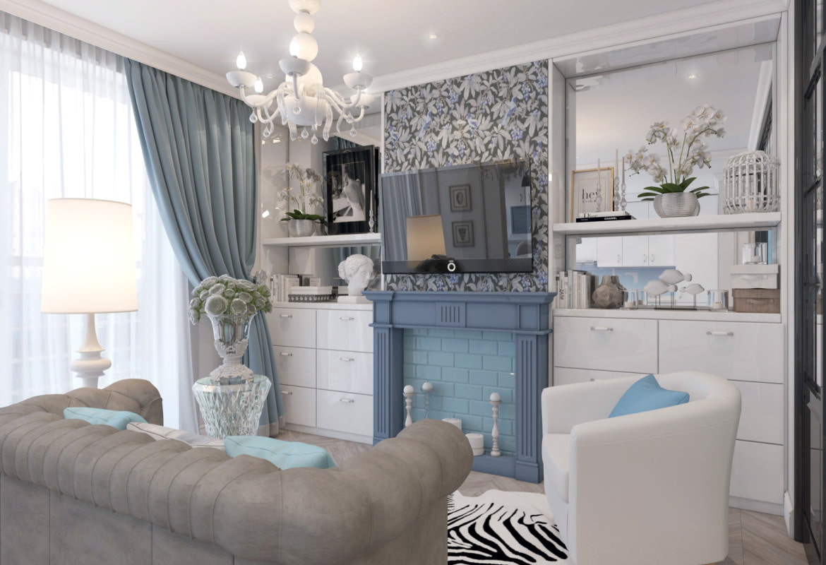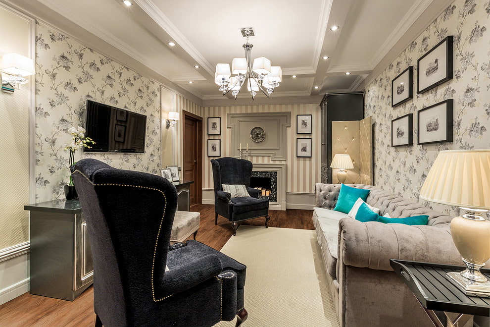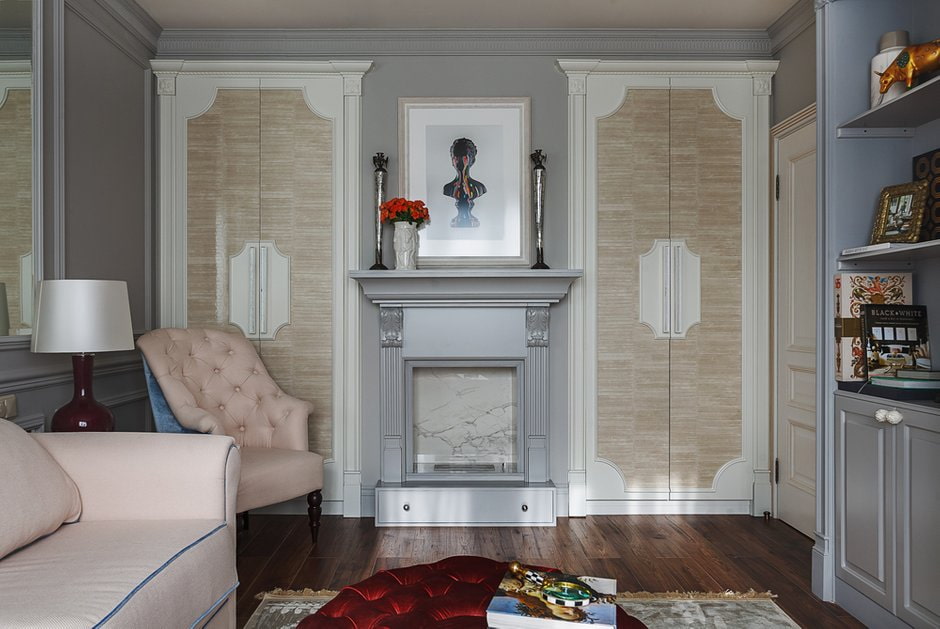 An important accent of a room in this style is a fireplace, not necessarily real. It can have a laconic finish or marble cladding.The wall above the hearth is decorated with a mirror or a painting, and furniture or other objects are placed on the side of it in a symmetrical order.