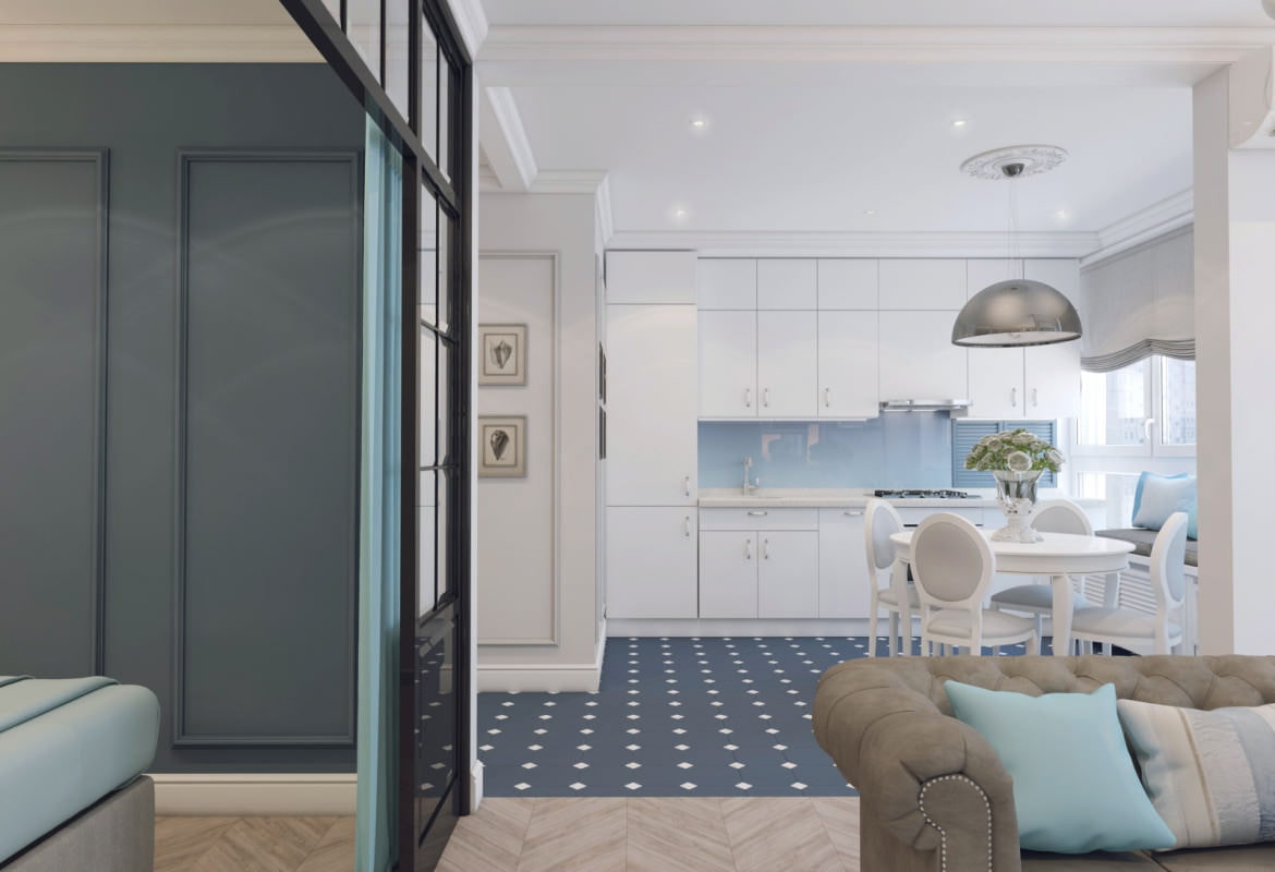 In the photo there are ceiling chandeliers in the interior of the kitchen-living room in the neoclassical style.