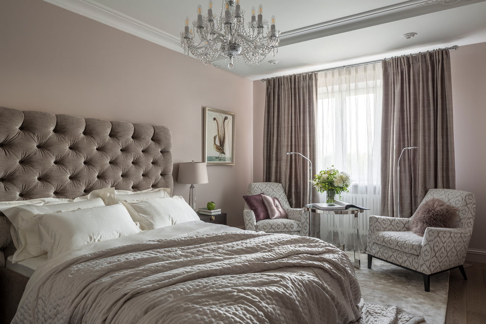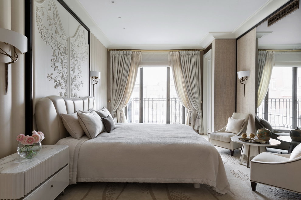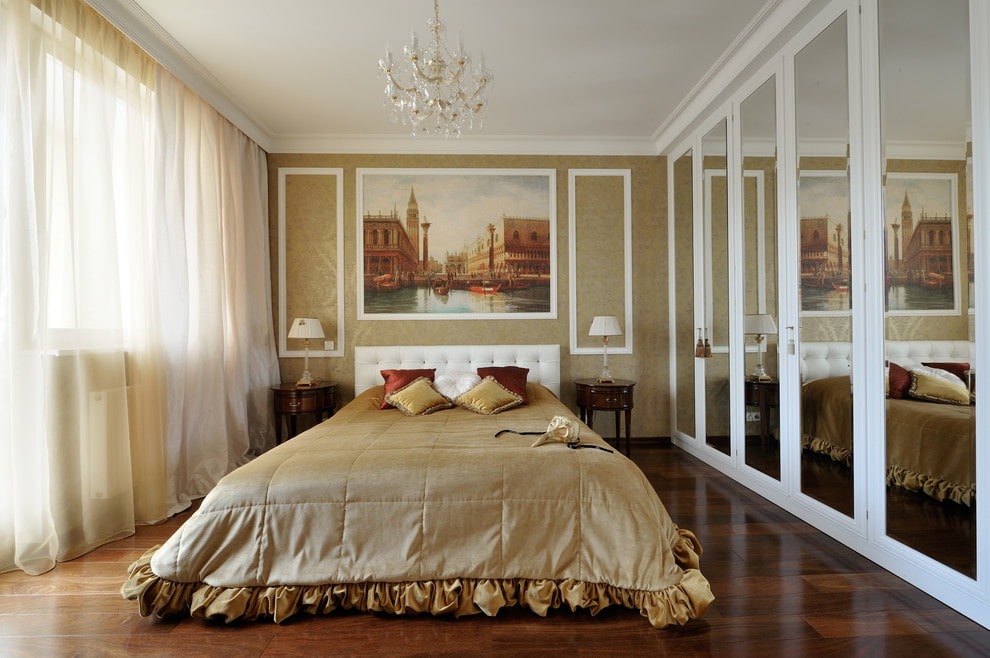 The neoclassical bedroom design is characterized by maximum symmetry. A bed, a ceiling chandelier and a carpet are used as central objects, relative to which other interior elements are built.
