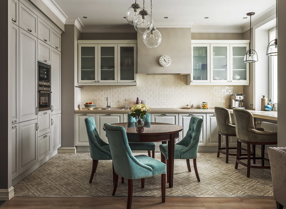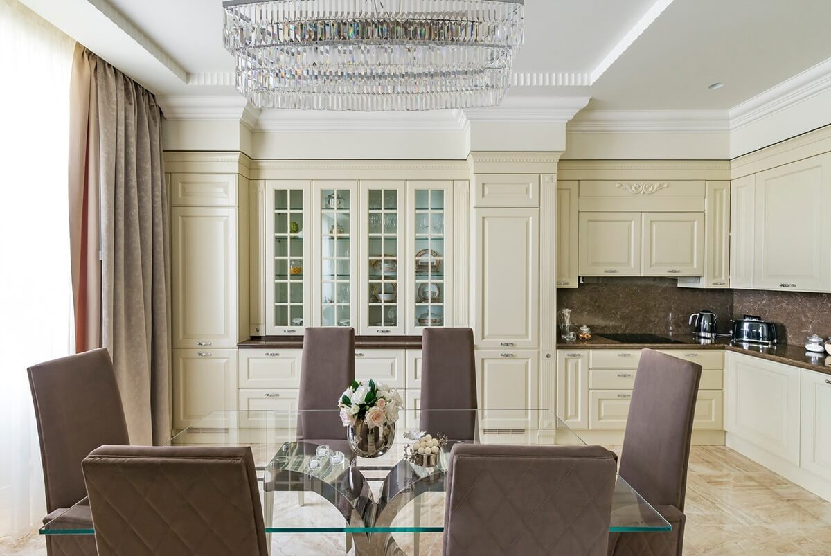 The dining room in neoclassical style contains natural materials in sufficient quantities. For floor cladding, the use of marble or porcelain stoneware is ideal. The working area is decorated with ceramics or washable wallpaper. For practicality, chairs with leather upholstery are chosen. In a small kitchen in Khrushchev, a light set with glazed facades looks more appropriate.