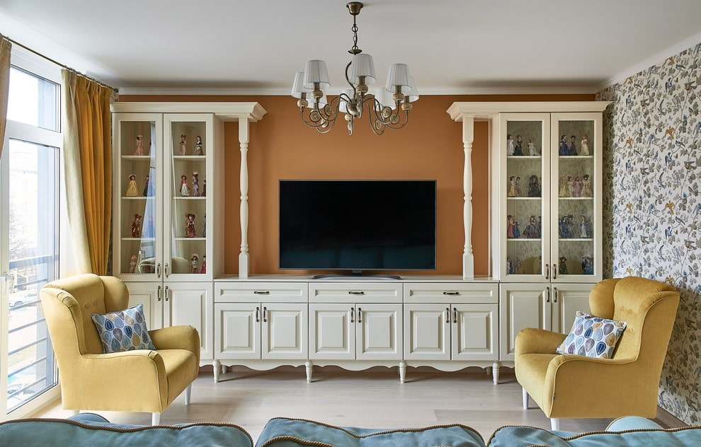 In the photo there is a living room in the neoclassical style with a light wooden wall for a TV.