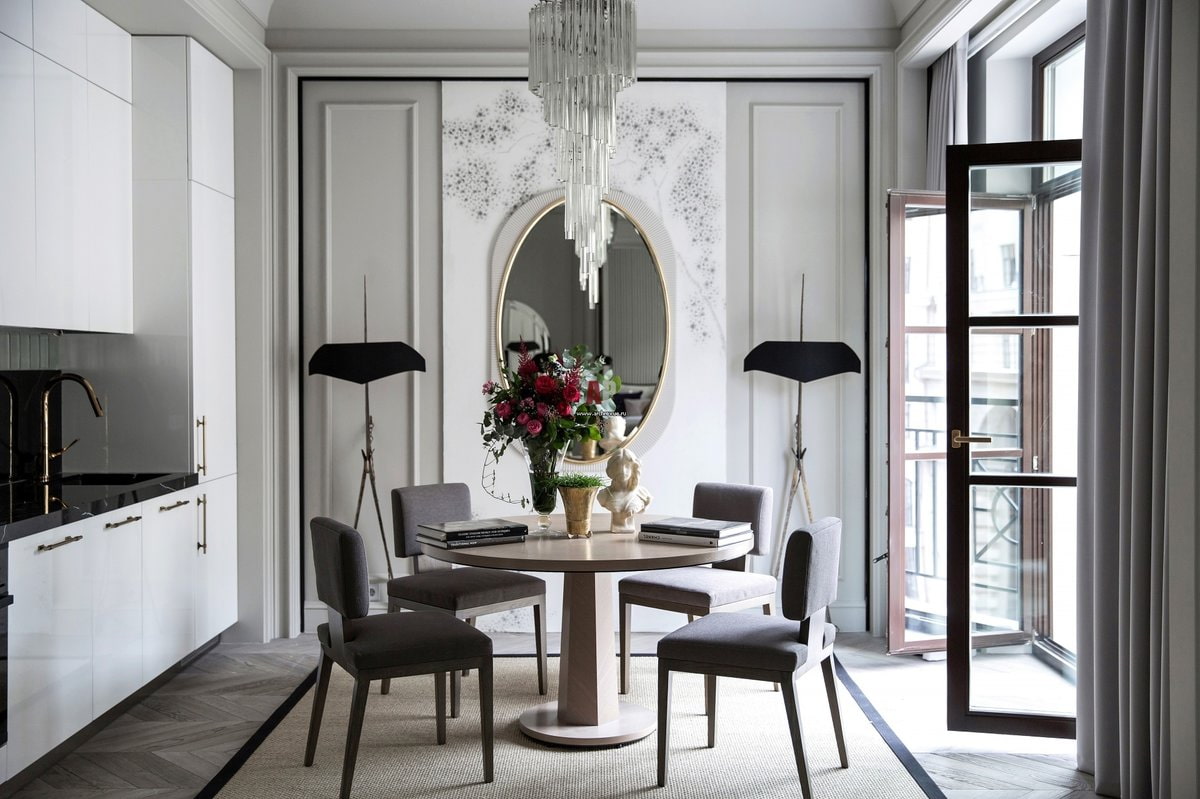 An apartment in the neoclassical style is distinguished by natural shades in interior design, symmetry in the arrangement of furniture and luxurious accessories and textiles.