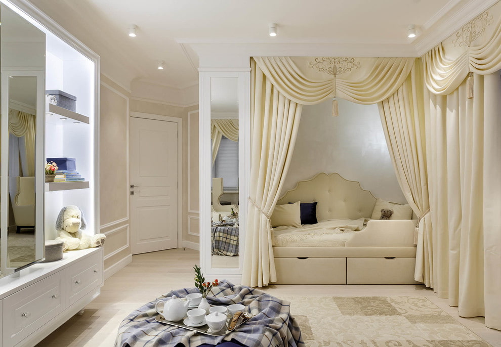 The photo shows the interior of the bedroom for a teenage girl, decorated in the neoclassical style.