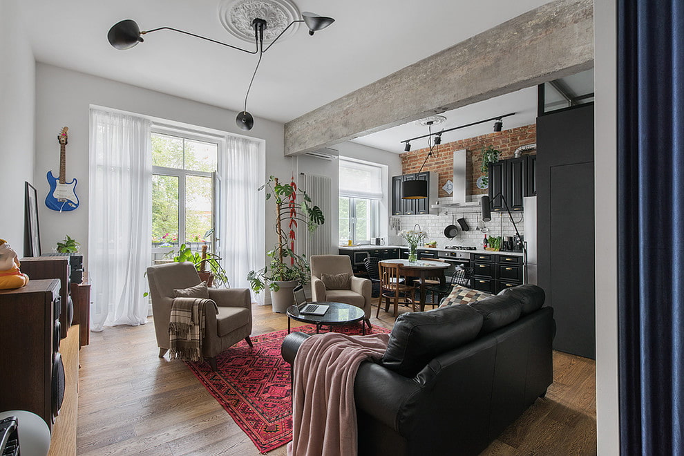 Concrete beamleft after combining kitchen and living room, can not you dismantle? Turn it into a dignity of the interior by painting it in the color of the ceiling or highlighting it in contrast, and place the furniture, focusing on its position.