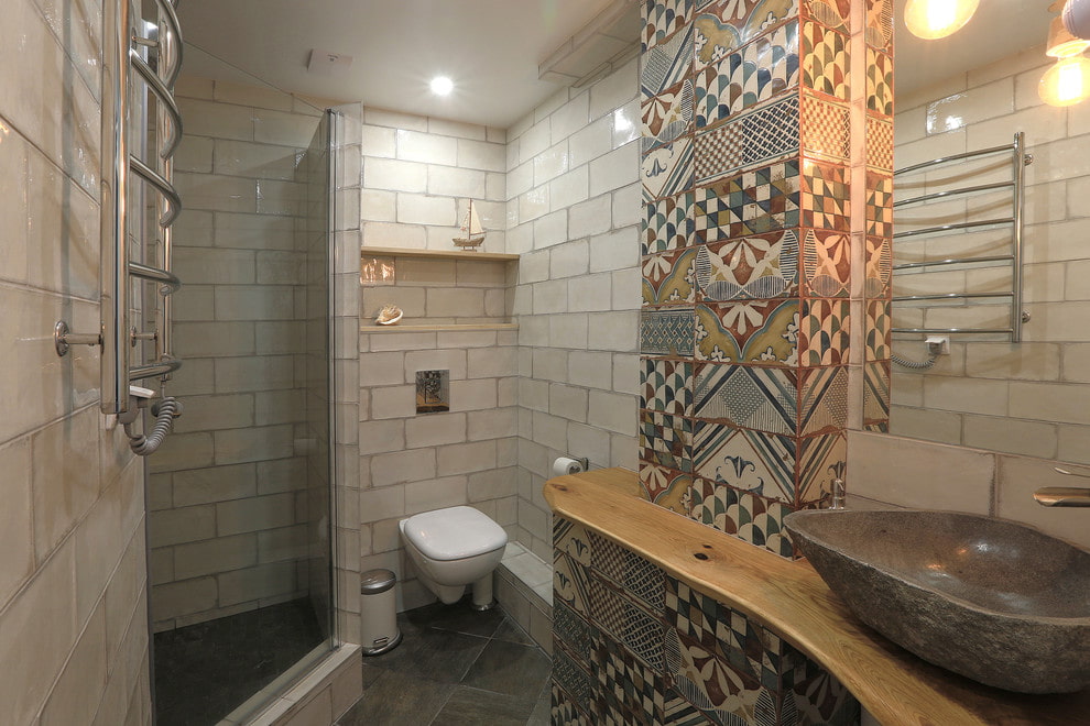 In this combined bathroom, the designer managed to convey the mood of the seaside: natural materials in the form of wood and stone, as well as colorful ceramic tiles, helped. Instead of hide a box with sewn-in communications, the specialist turned it into the brightest and most elegant piece of furniture.