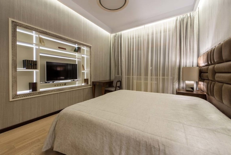 In the photo there is a large bedside niche in the wall, equipped with spotlights in the interior of the bedroom.