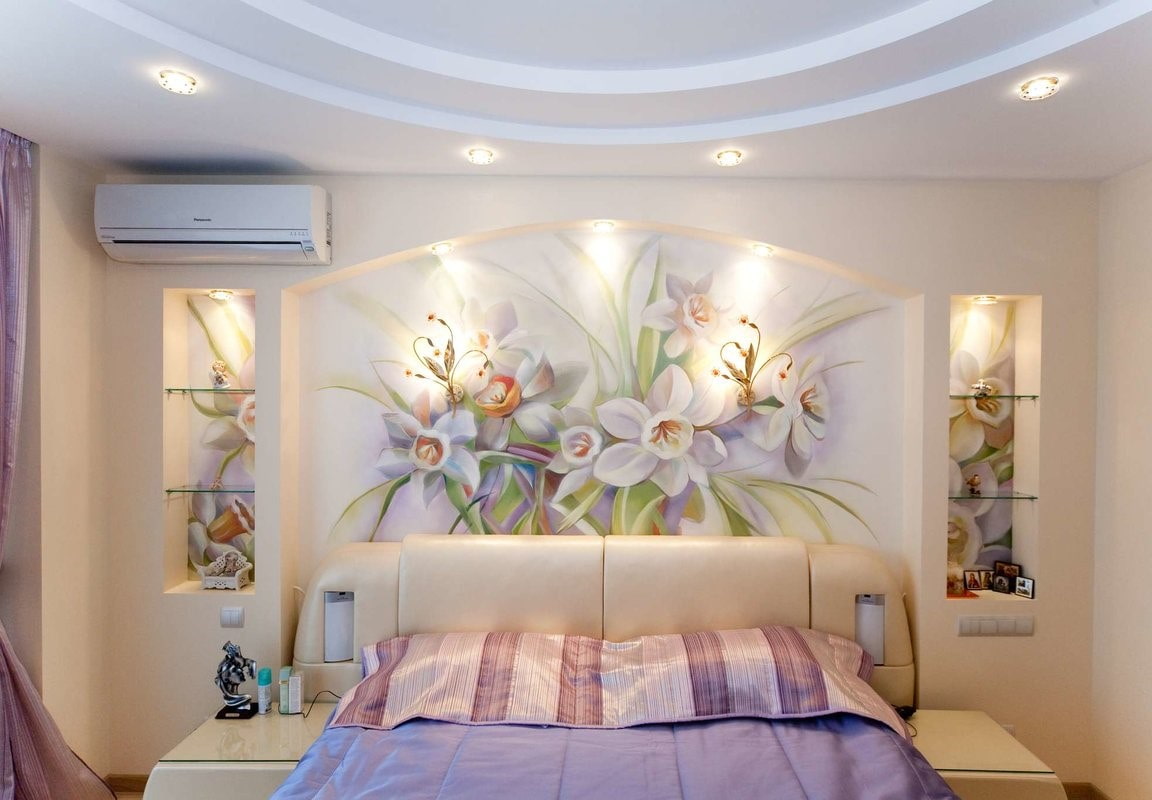 In the photo there is a niche at the head of the bed, decorated with painting in the form of floral drawings.