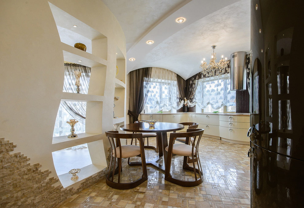 This structure in the wall is not only an unusual composition, but also a functional architectural detail that allows you to conveniently place a dinner service, dishes, indoor flowers or other decorative elements.