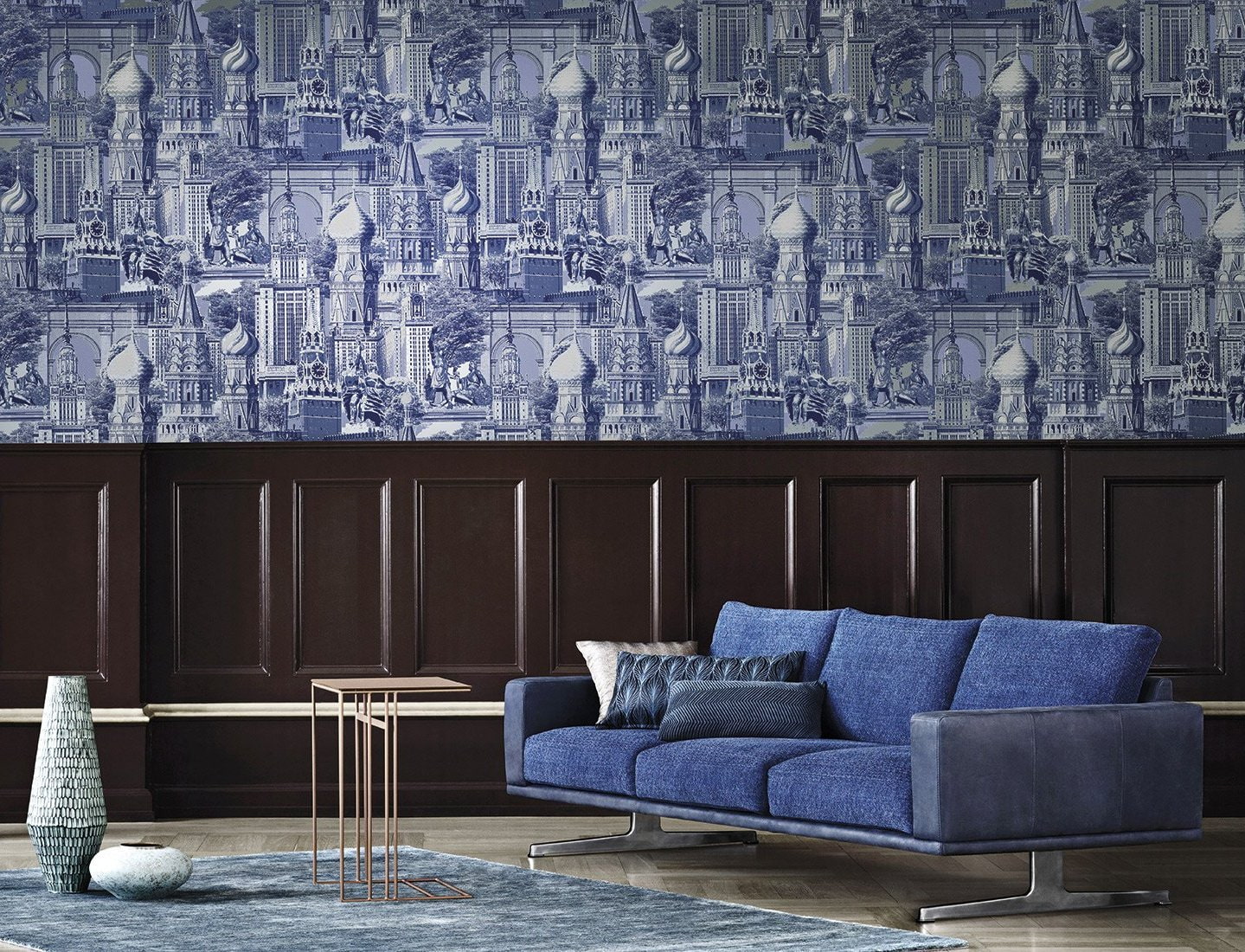 The photo shows a living room with a wall decorated with wallpaper depicting a city in purple tones.