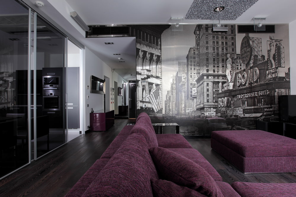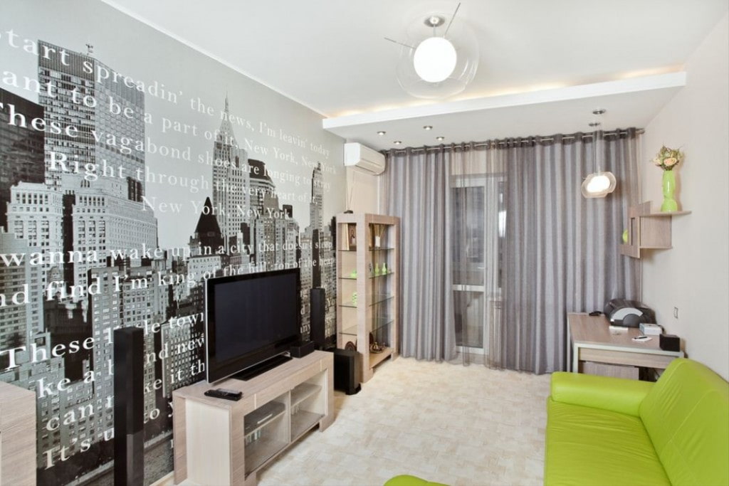 Large-format panoramic images of modern metropolises are often found here, decorated in bright or black and white colors. They will especially emphasize the refined style of the living room interior.