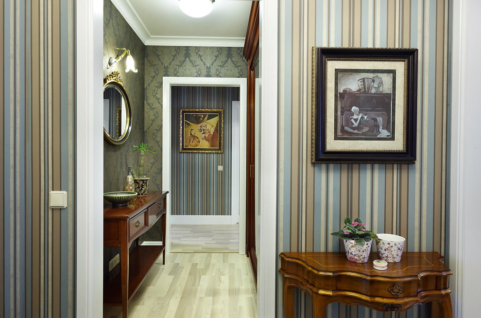 In Khrushchev and standard city apartments, the hallways do not differ in a large area, paired wallpaper companions will make this room more interesting and voluminous.