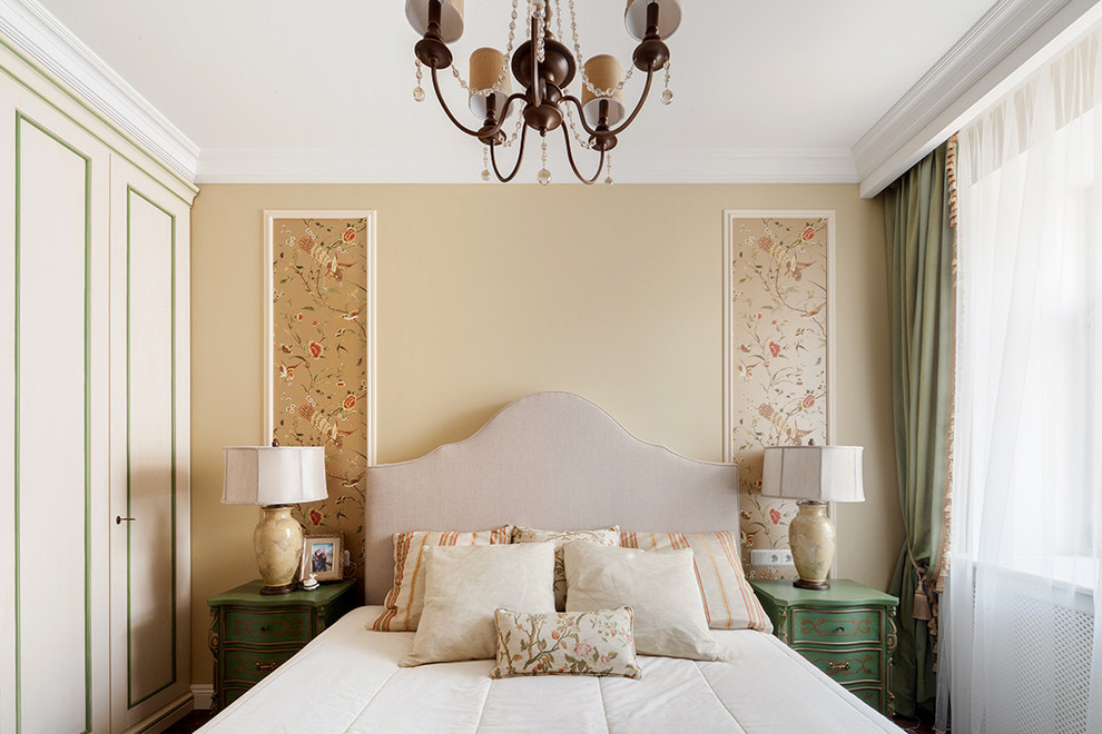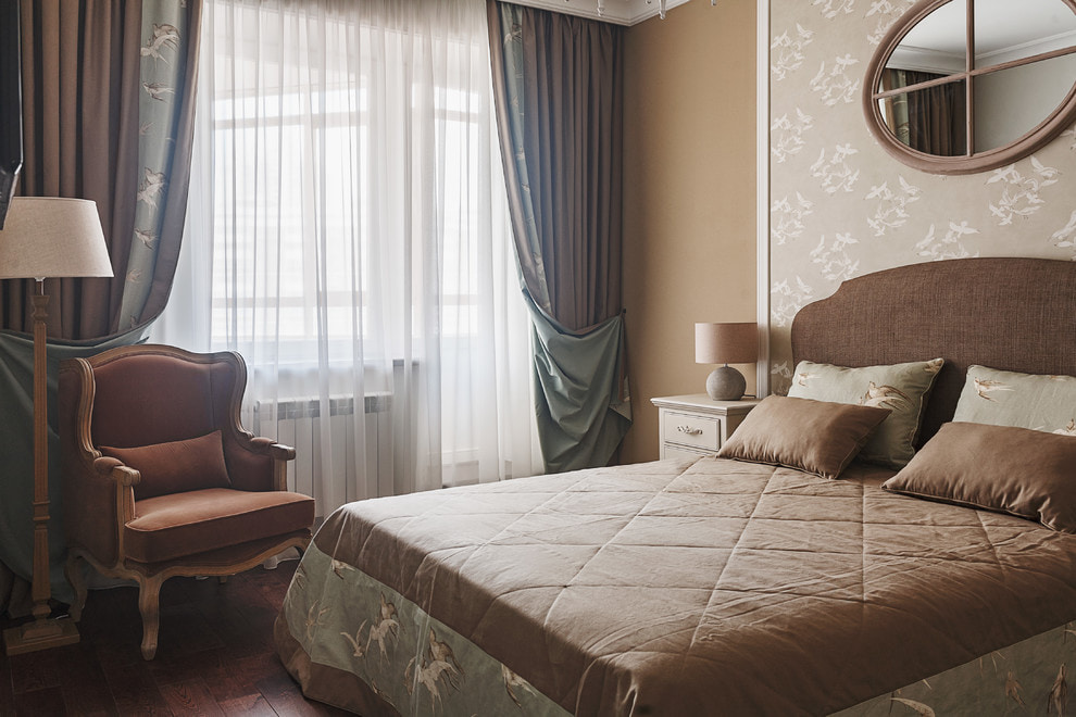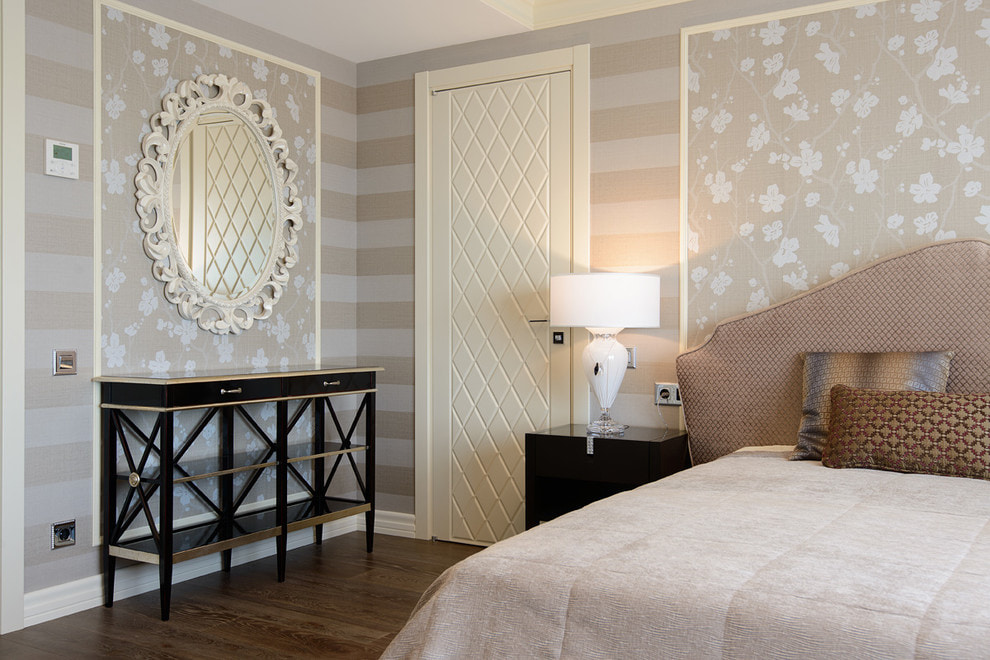 On the picture bedroom in neoclassical style. The walls are decorated with companion wallpaper in a horizontal manner.