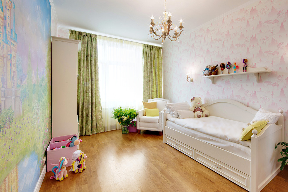 On the picture children's room for a girl. Companion wallpapers have different colors, but are united by theme. Castles are depicted on both walls.