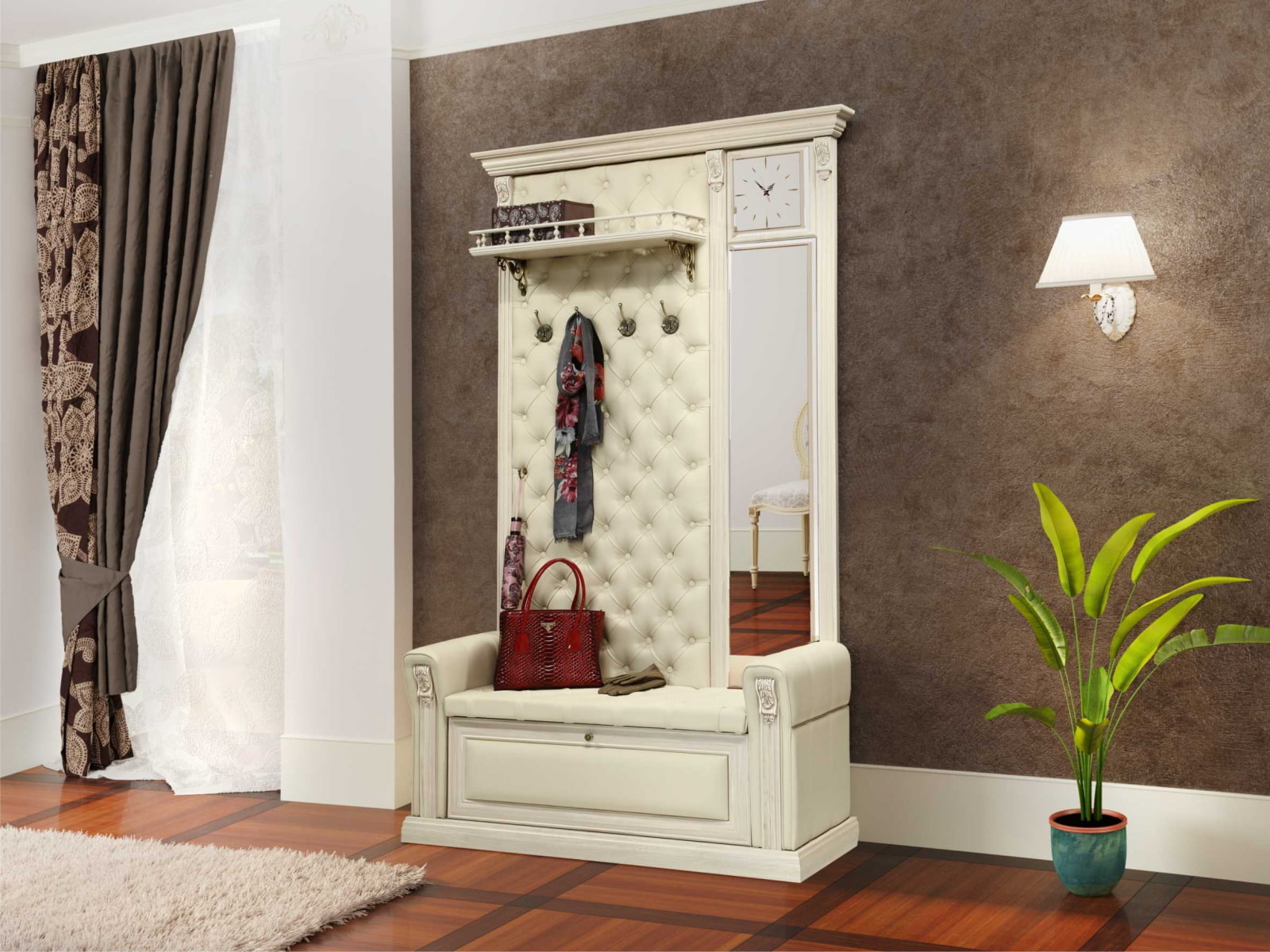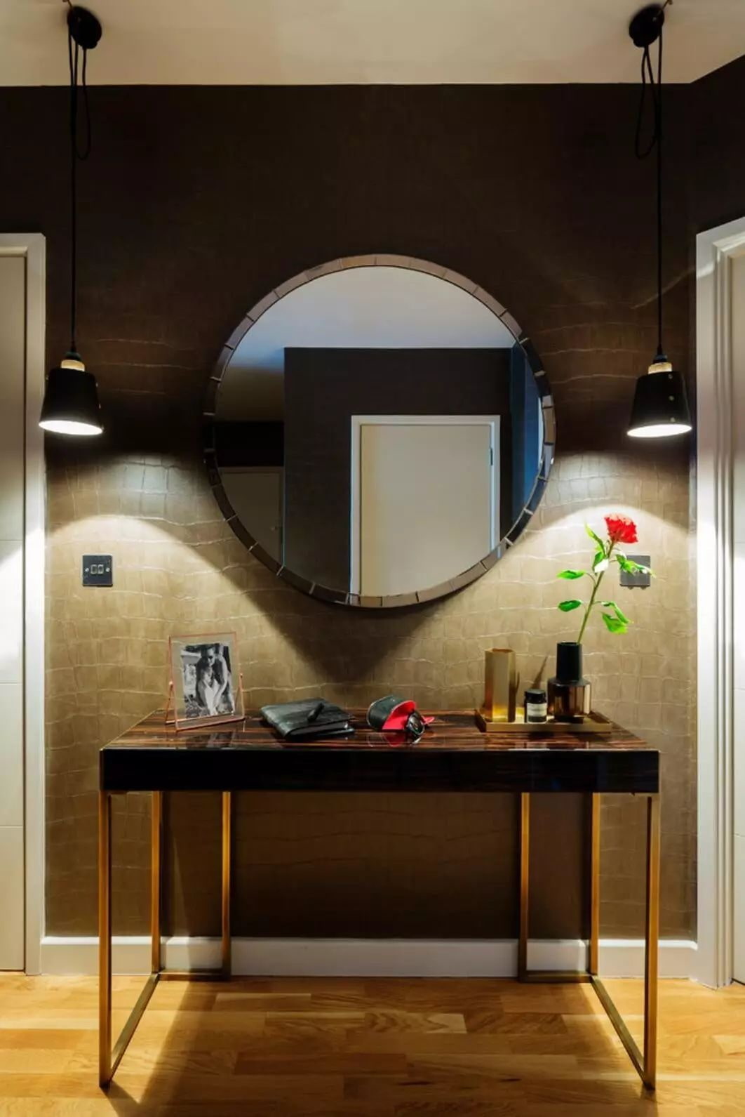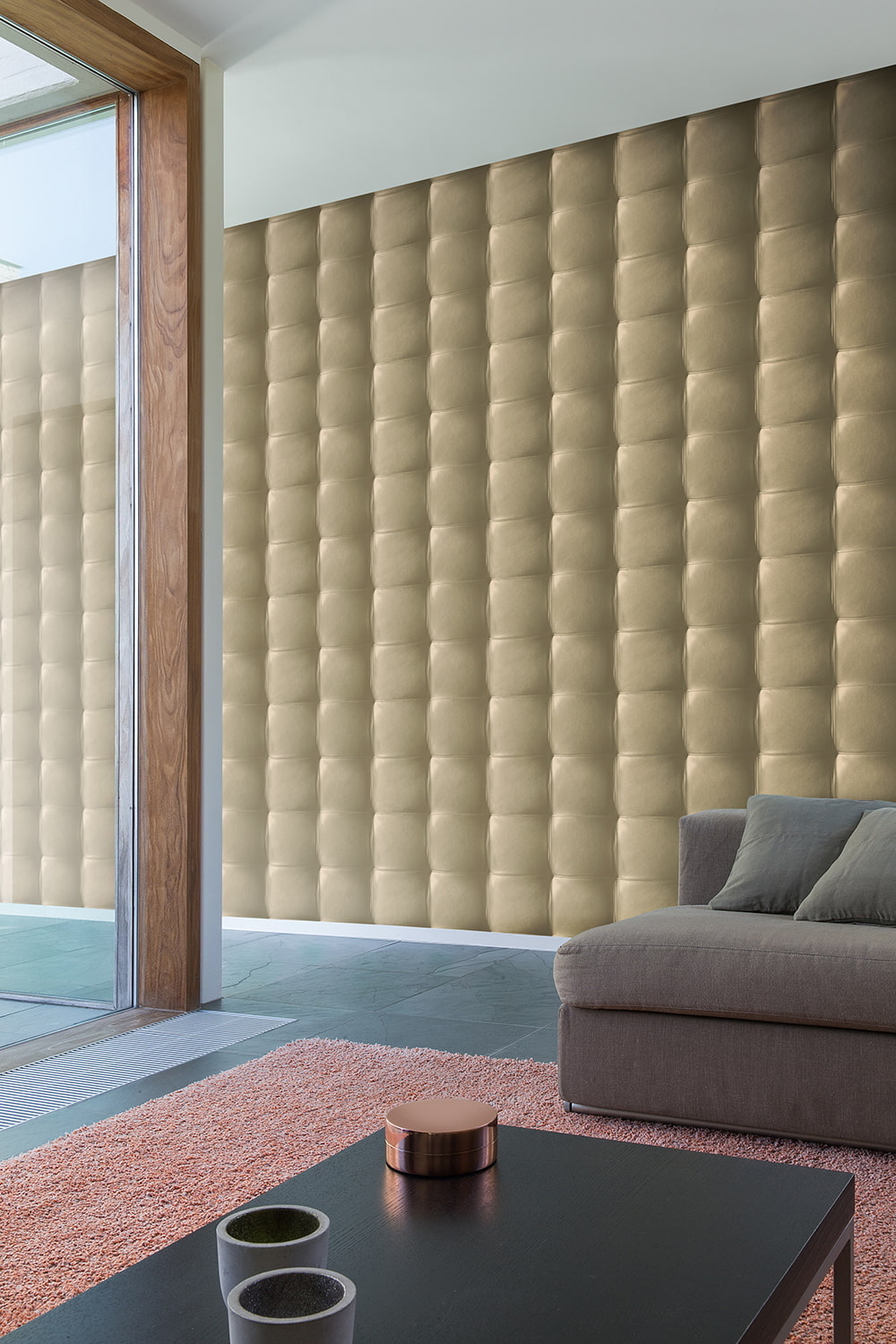 In the photo there is a hall and wallpaper with the effect of quilted leather.