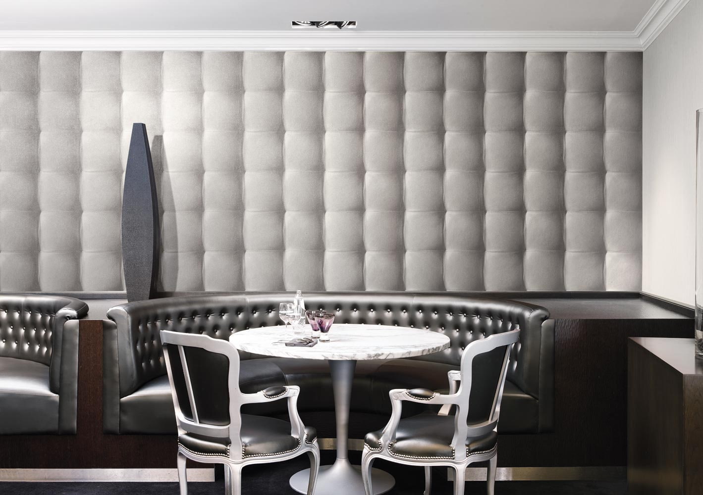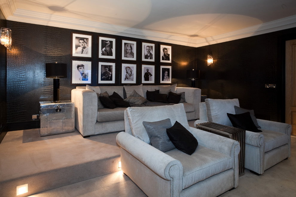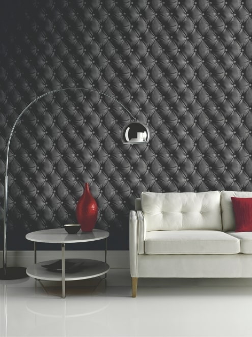In the photo there is a living room with walls decorated with black leather-like wallpaper.