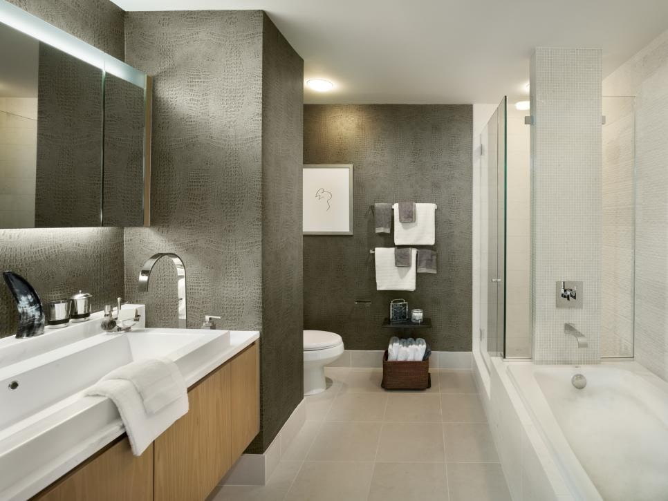 In the photo you can see the wallpaper imitating the skin in white in the interior of the bathroom.