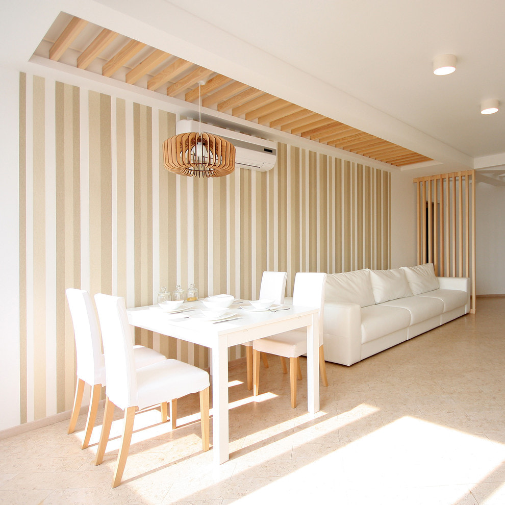 The popularity of stripes is due to their ability to influence the visual perception of space. Vertical stripes will "increase" the height of the room, and the wider the stripe, the more pronounced this effect will be.