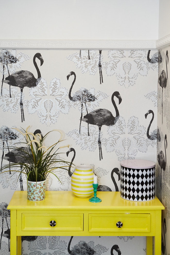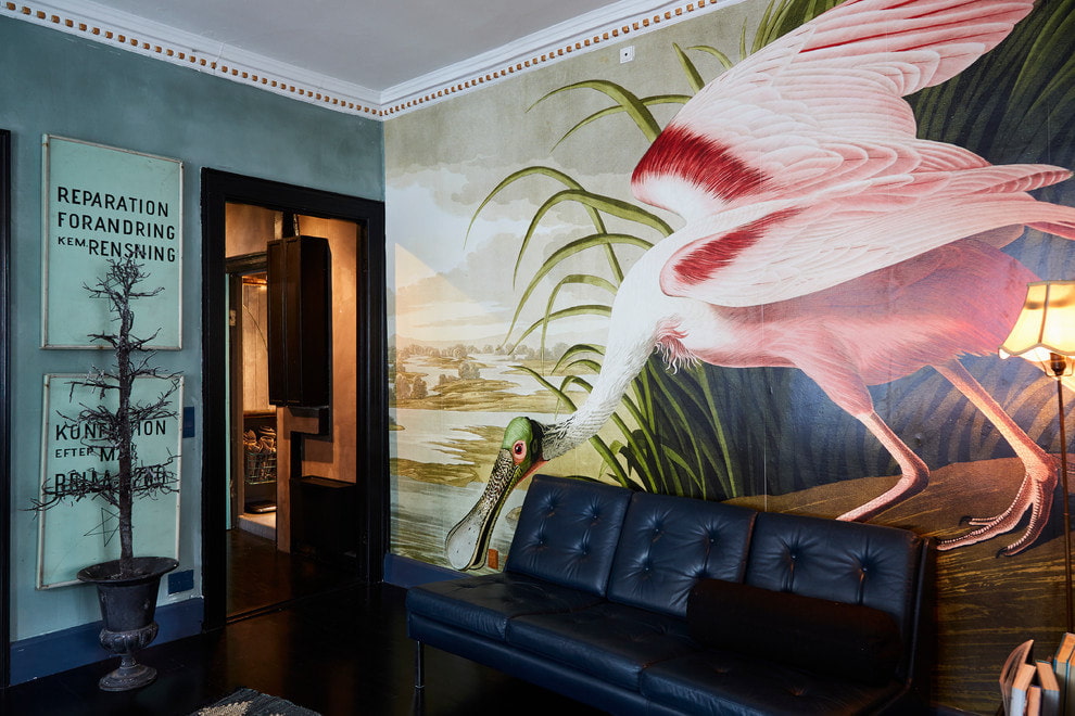 In a modern style, it is permissible to use bright colors, shifting materials and bold designs. 3D wallpapers with stately flamingos, silhouettes in the sky or chic peacocks will decorate an accent wall in any part of the room, be it a living room with a complex layout or a bathroom. Stylized drawings or realistic birds on a dark background will look interesting.