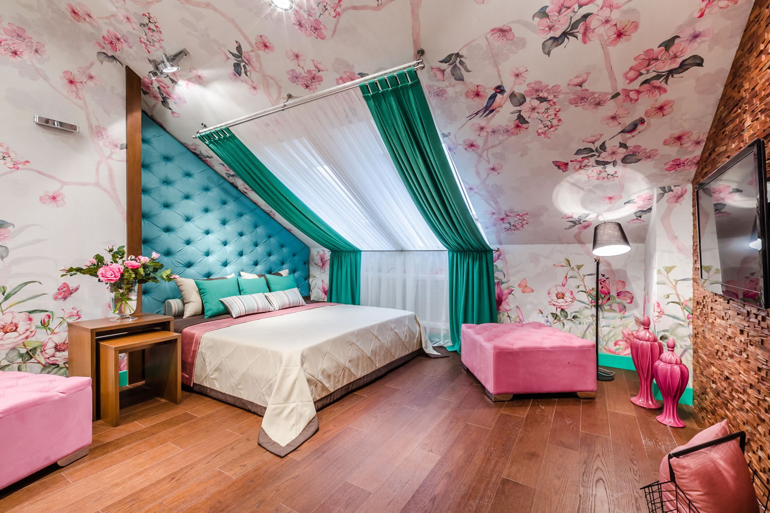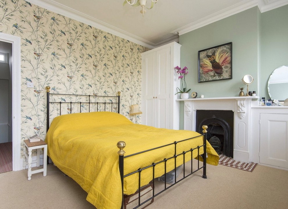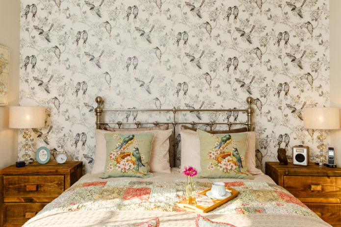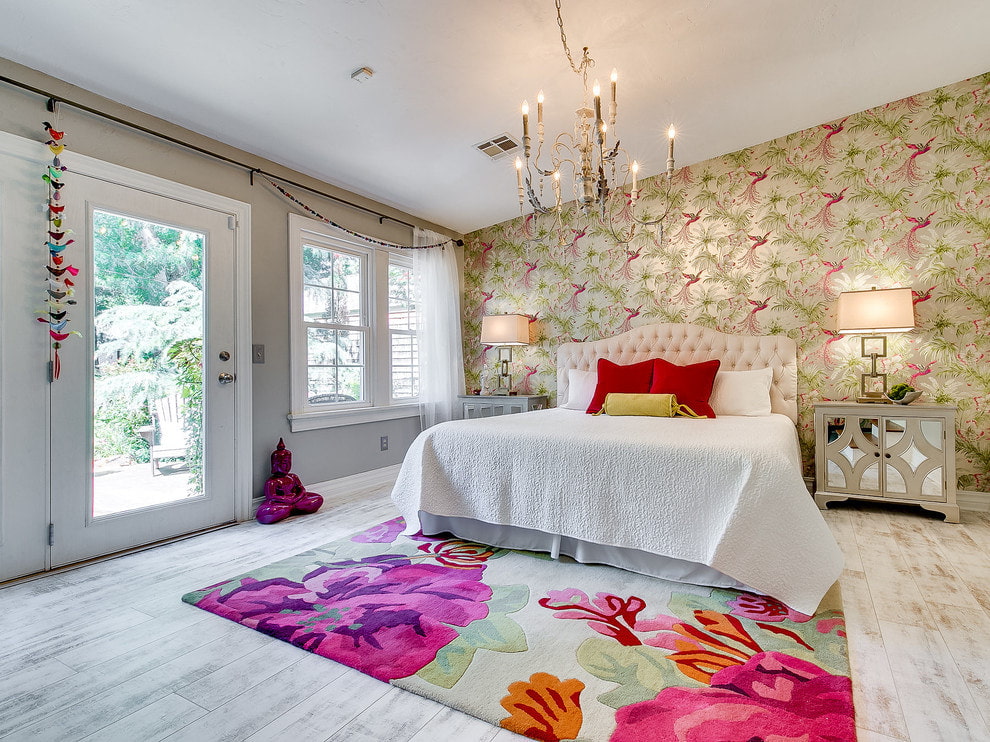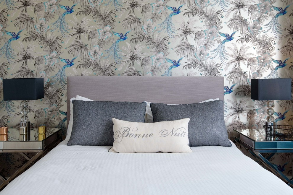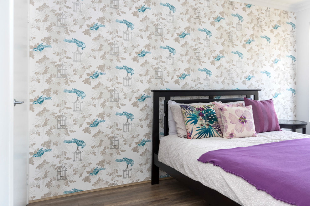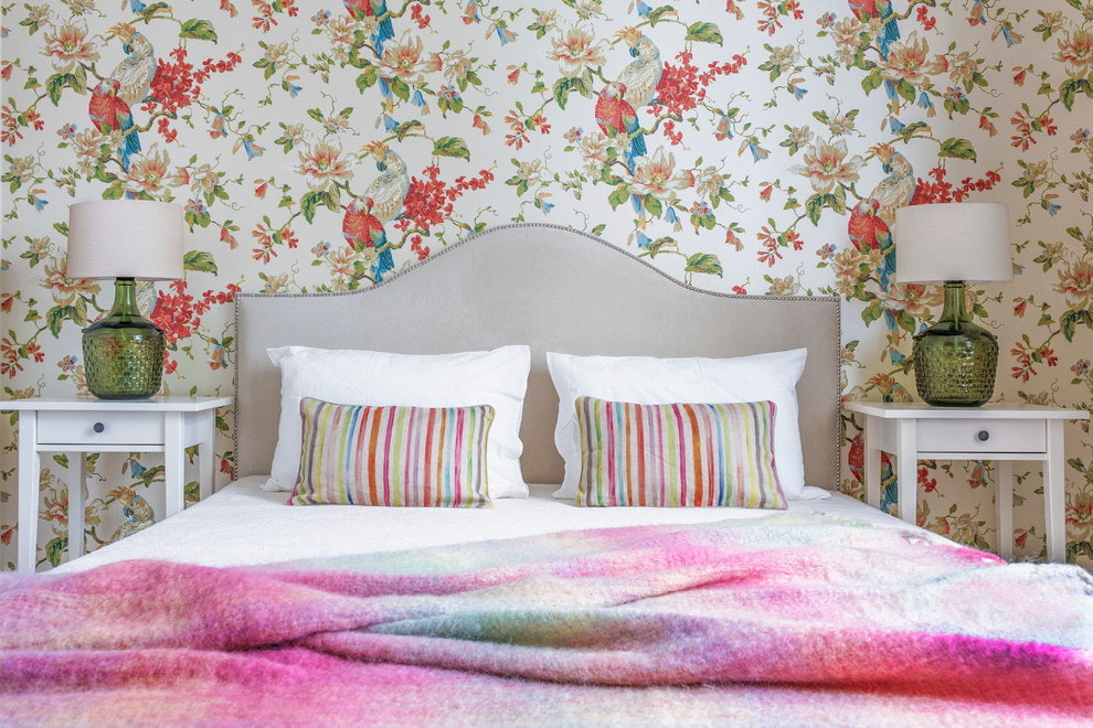 On the picture the wall above the headboard is decorated with wallpaper with parrots. The colors echo in all the details of the interior.