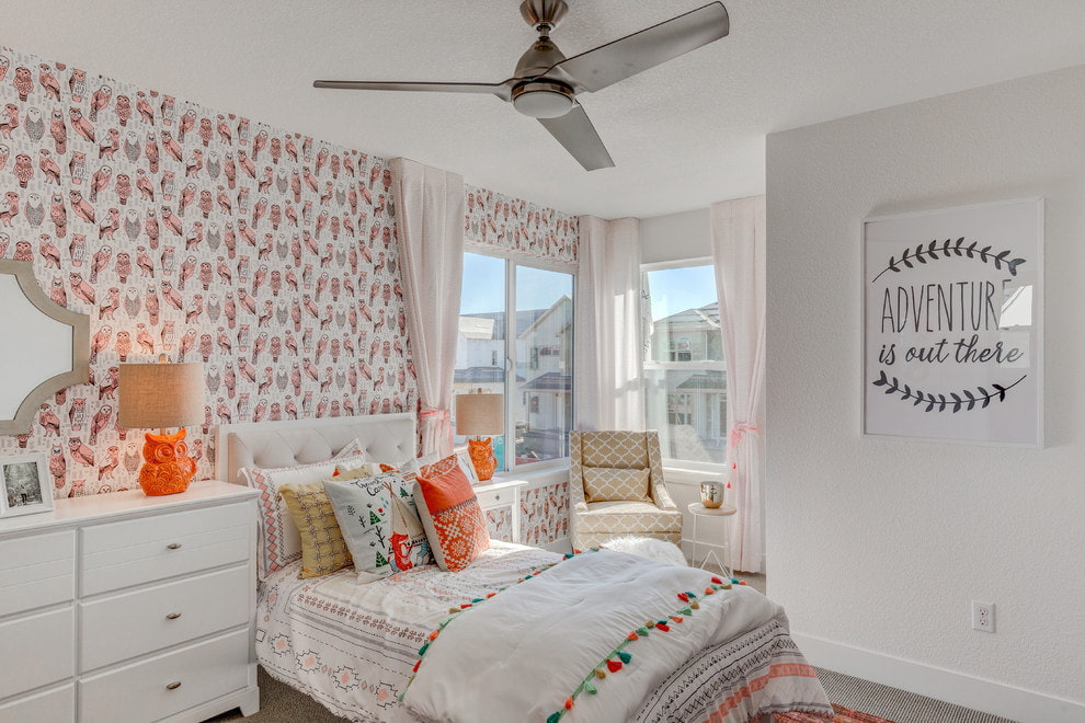 A great idea for creating a cozy and positive atmosphere in the children's room. The print can be different, depending on the color and picture, it is suitable for a girl's and a boy's room. For example, for a boy's room, the walls can be decorated with wallpaper with stylized graphic owls, for a girl, fabulous Chinoiserie birds are suitable, and in a teenager's room, the walls decorated with photo wallpaper will become the main accent.