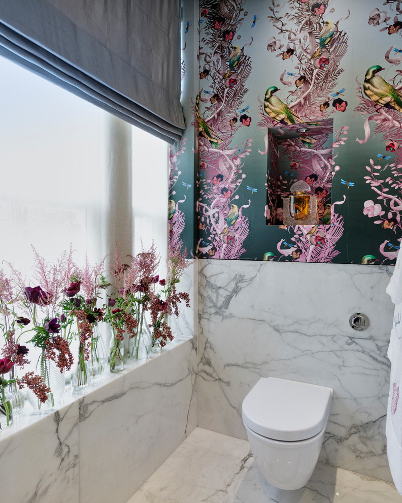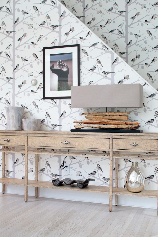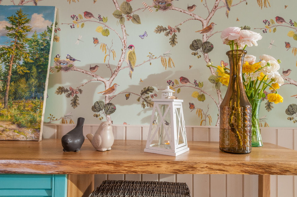 The combination of flowers and birds is most often used in the form of a small pattern. The combination is light, playful and romantic, suitable for decorating a hall or bedroom. Be careful with large images. Such wallpaper can make the room visually smaller. A good option for finishing wallpaper with a volumetric pattern would be a partial decoration of the walls of the room.