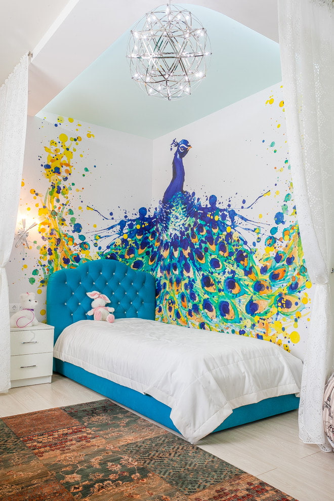 Wallpapers with fabulous creatures will make the interior romantic and fantasy. Such a finish will be a good option for creative, romantic and dreamy natures. The background will also complement the picture, it can be neutral and monochromatic, or with an ornate or graphic pattern.