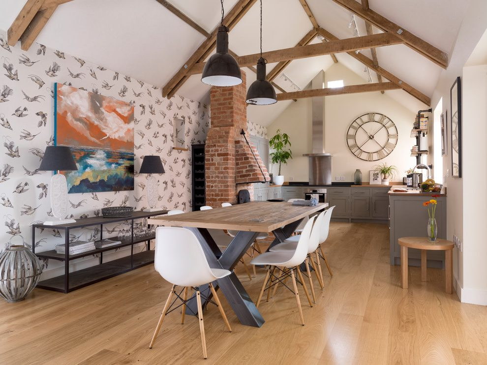 Walls decorated with wallpaper with birds will complete the classic, modern or Provence style in the kitchen.For a small kitchen, it is better to use wallpaper with a light background and a small pattern, in which case they will not hide the space, but will only emphasize the mood in the room. Wallpaper trim can also be combined with wood panels.