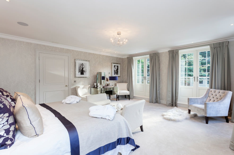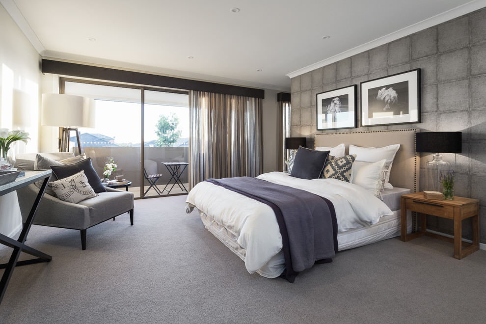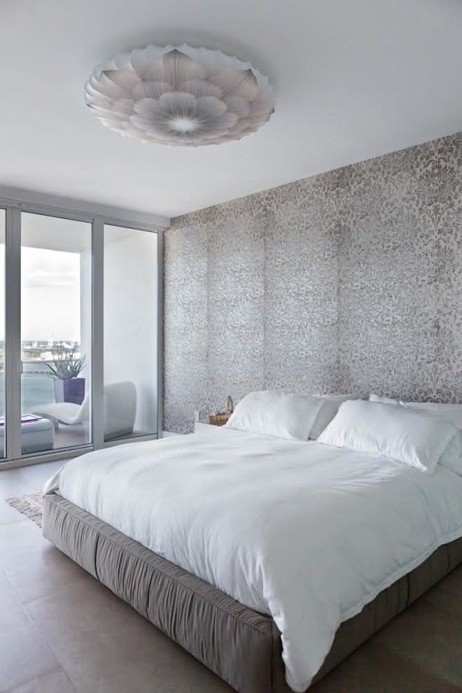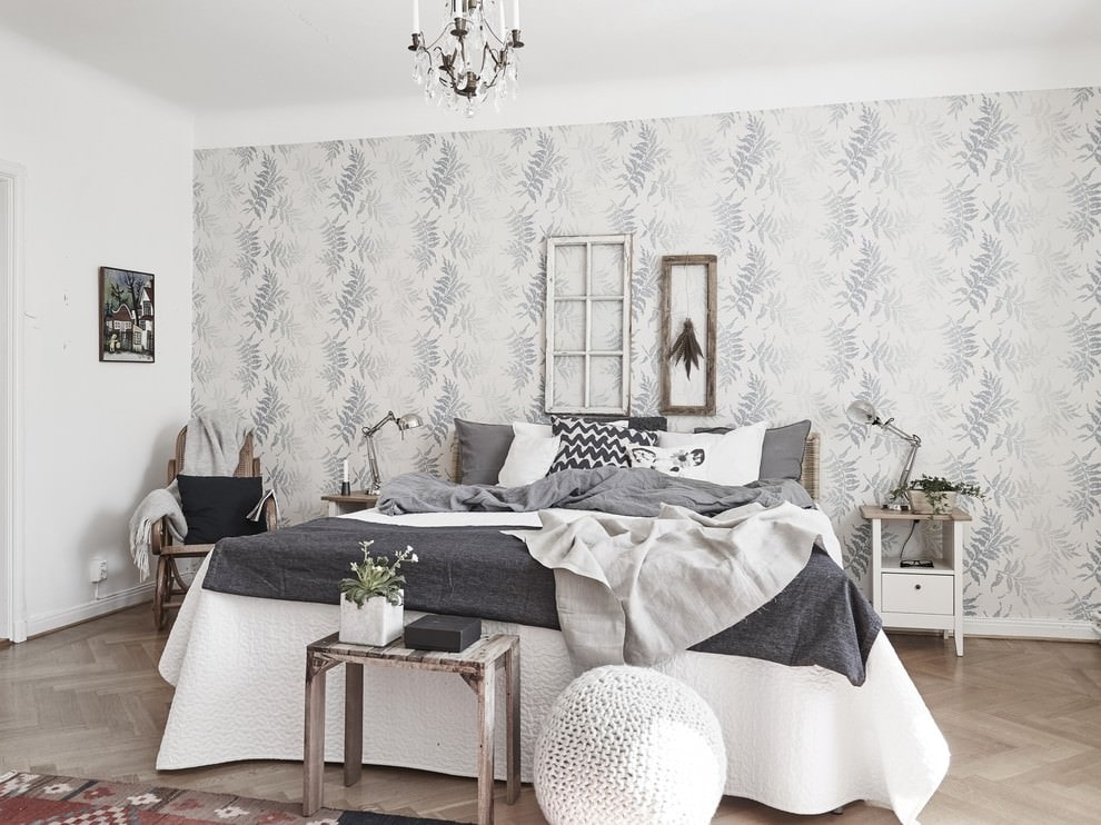 On the picture accent wall in the bedroom is decorated with gray wallpaper with 3D effect.