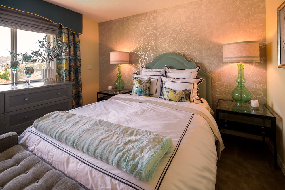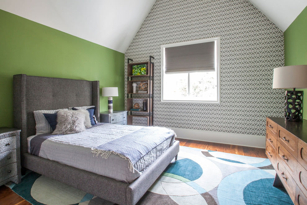 - Gray green wallpapers in different shades create a different mood. For a modern-style room, you can combine light gray with greenery, tea tree and pistachio. An excellent combination of colors for bedroom decoration.