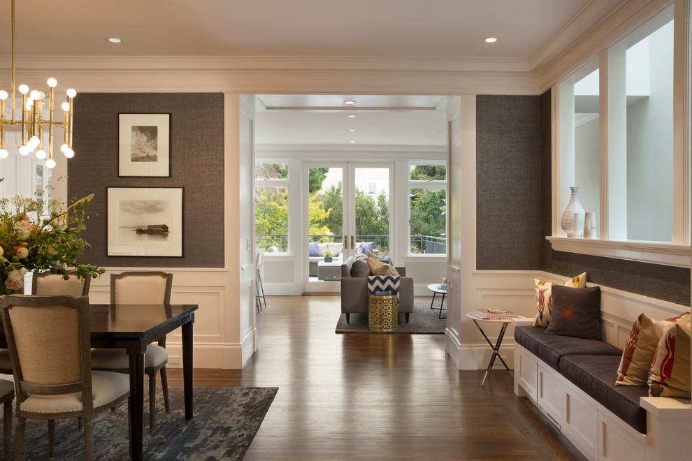 - In a white kitchen, the dining area can be distinguished by gray wallpaper with light patterns.