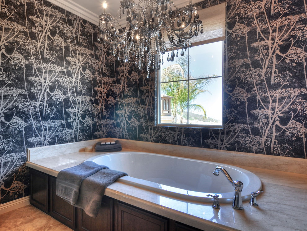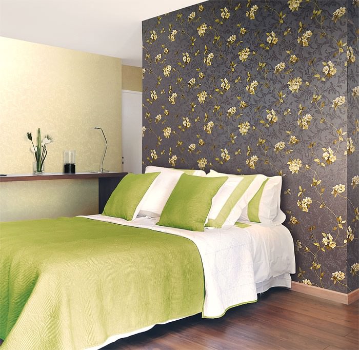 - Wallpaper with flowers suitable for classic and modern bedrooms. The color of the picture can be gold, white, to match the curtains or furniture.