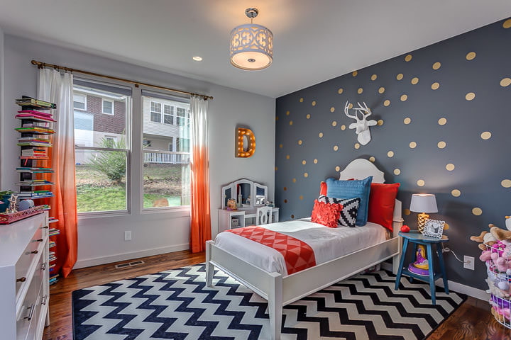 - Gray walls in the bedroom set a calm tone in combination with a companion color.