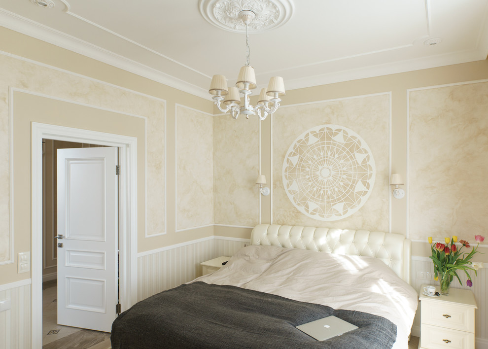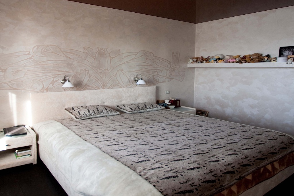 With the help of Venetian plaster, you can maintain the rigor of the room design, add prestige to it, or, conversely, dilute the coldness of the interior with an ornament with flowers.