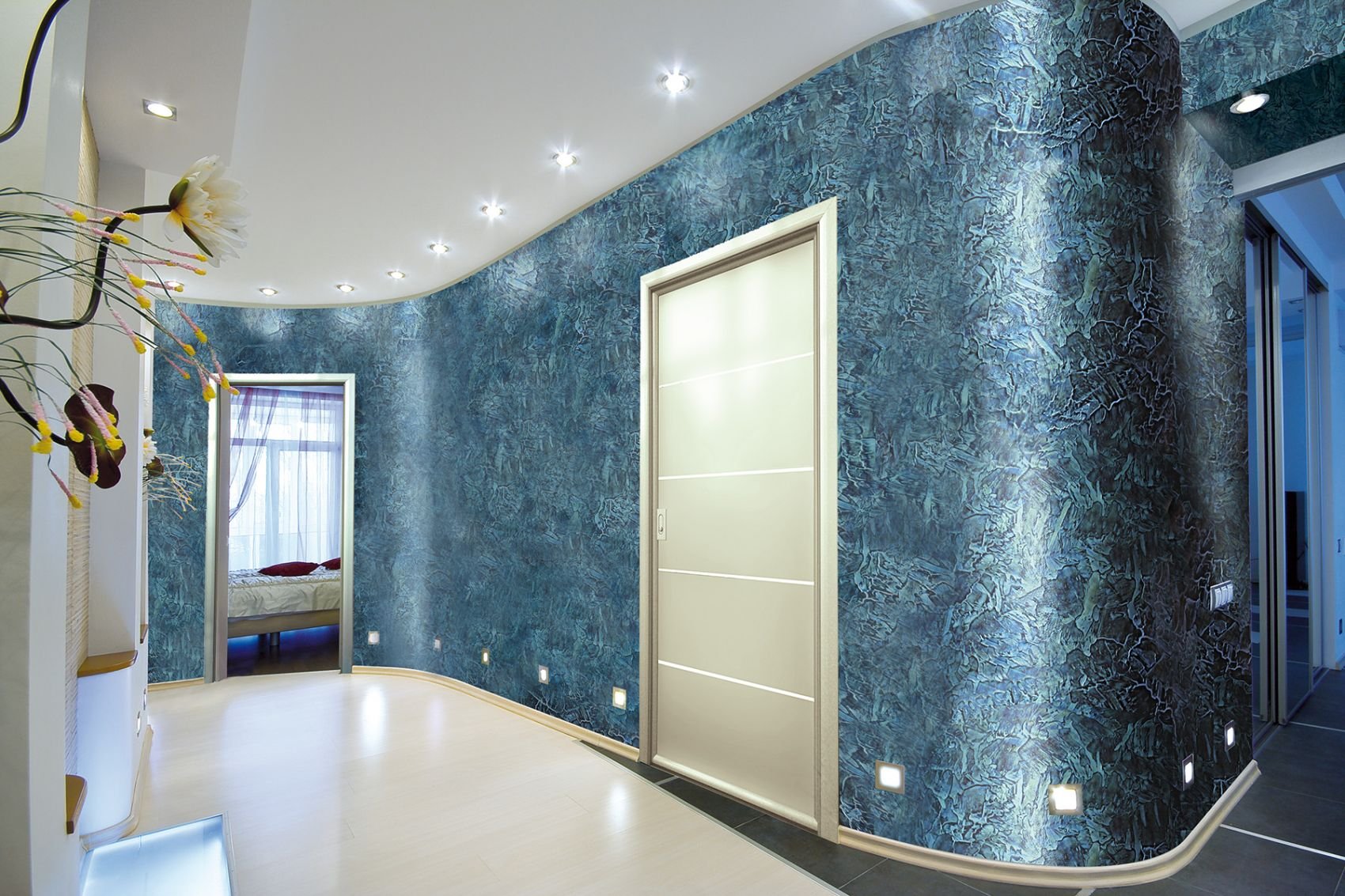 A small space implies a small pattern and light colors. If the corridor is large, it can be finished with plaster with a metallic sheen - it will shimmer beautifully when the lights are on.